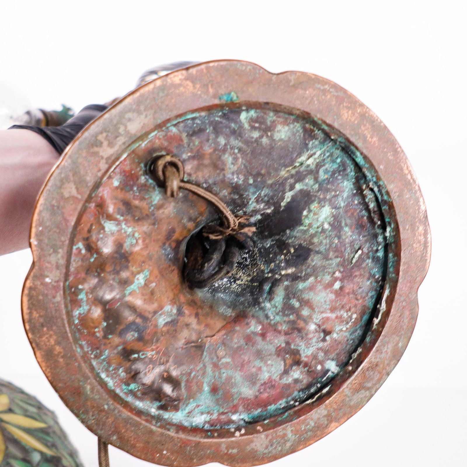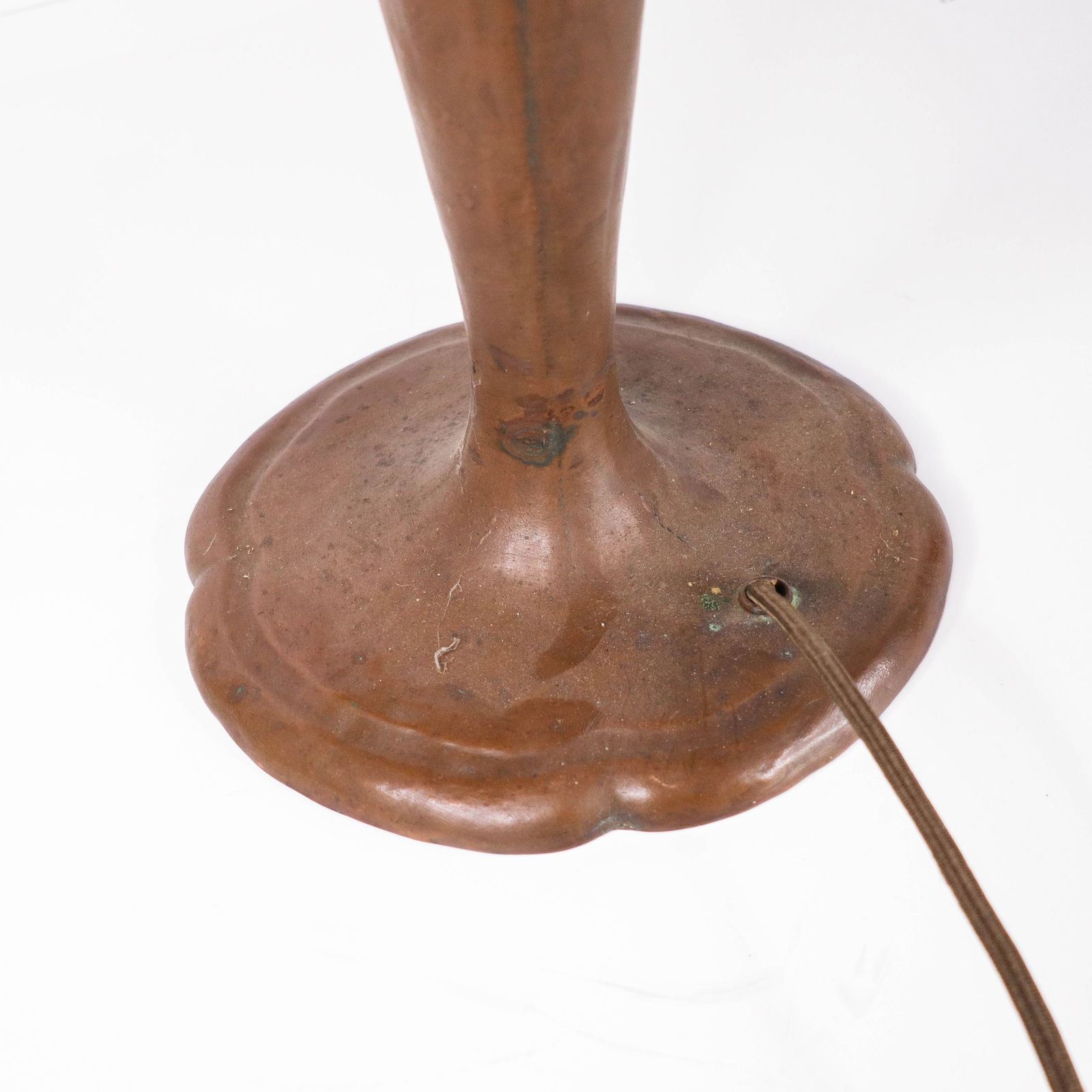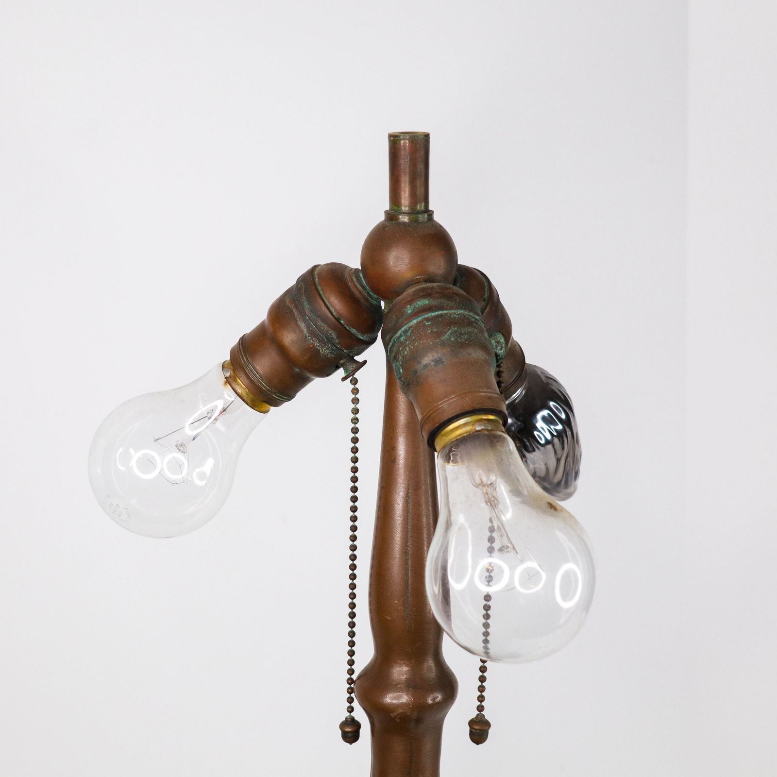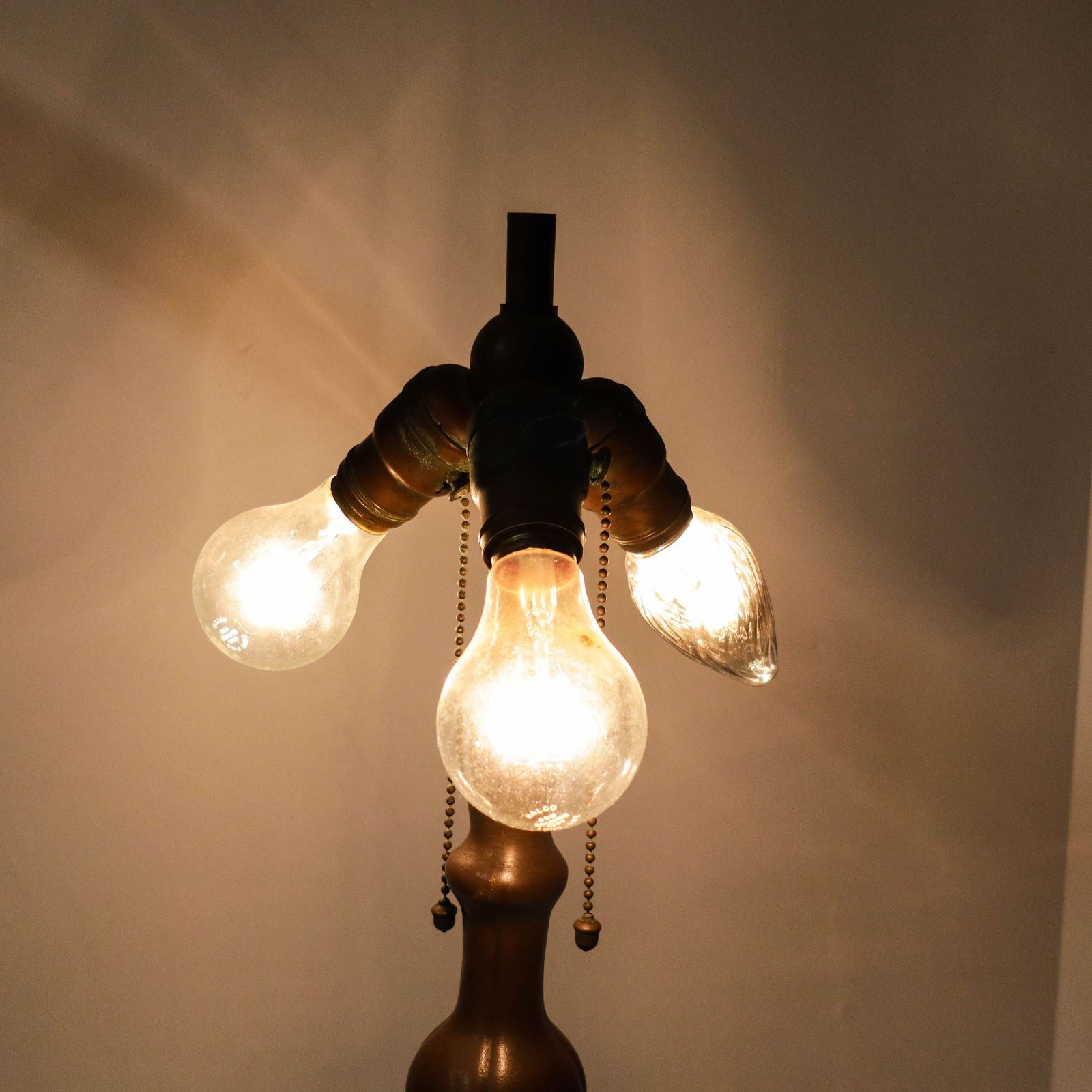18" diameter Unique Studios leaded floral lamp with irregular border. Fantastic color and detail. Set on an original Handel base having two acorn pulls. 23" high
