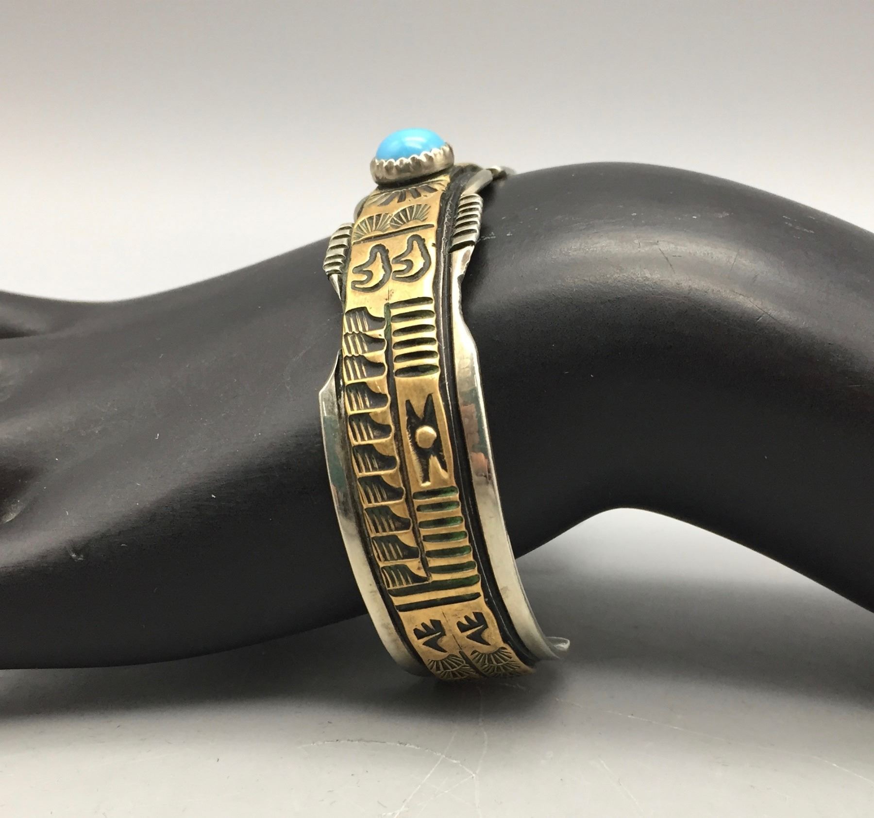 Description: For sale in this lot is a sterling silver bracelet with a storyteller kind of scene in the jewelers bronze overlay. It has a faux turquoise stone. Maker: Hallmarked T. Enreka. Approx. Age: Vintage. Size: Fits a 6-7/8” wrist. Weighs 36.4 grams. Condition: Good for its age, normal wear expected. Please look closely at the pictures - they are an important part of our description. Shipping: There will be a $5 handling / packaging fee for shipping this lot. The actual cost of postage will be added on top of that.