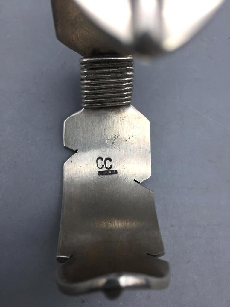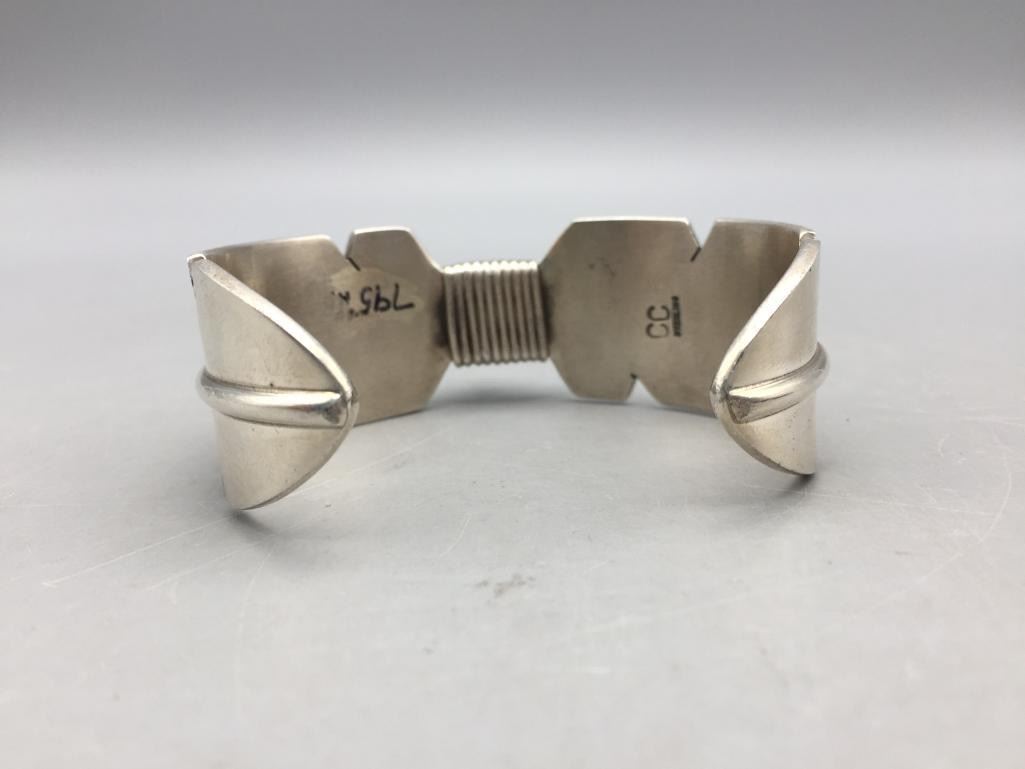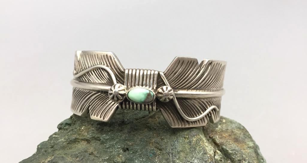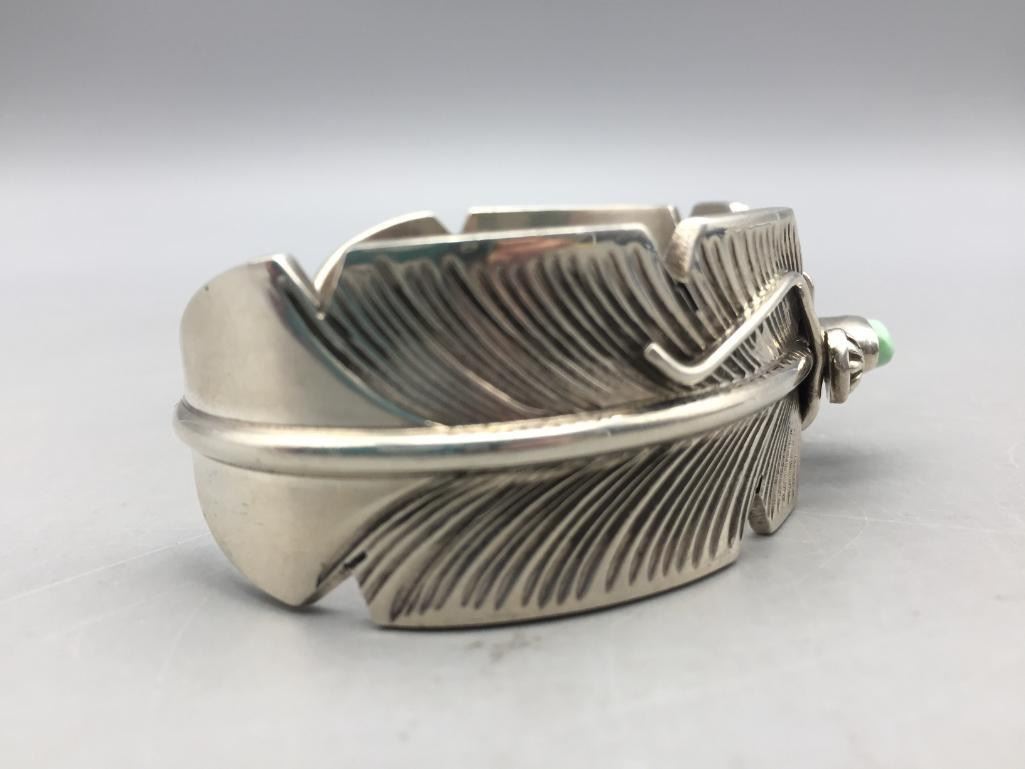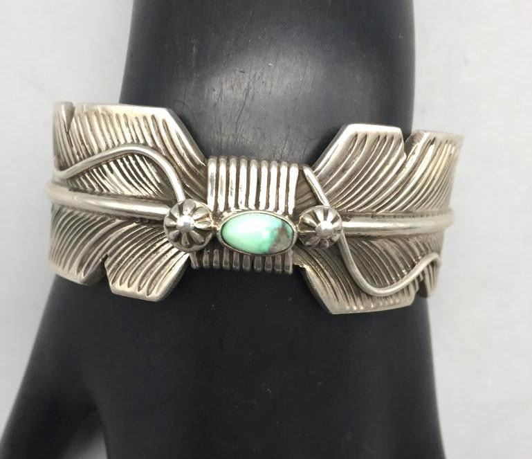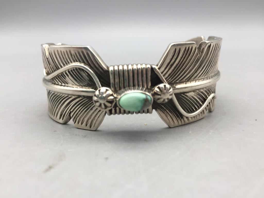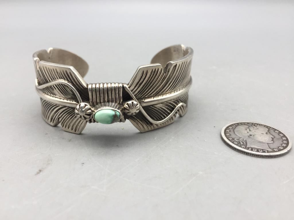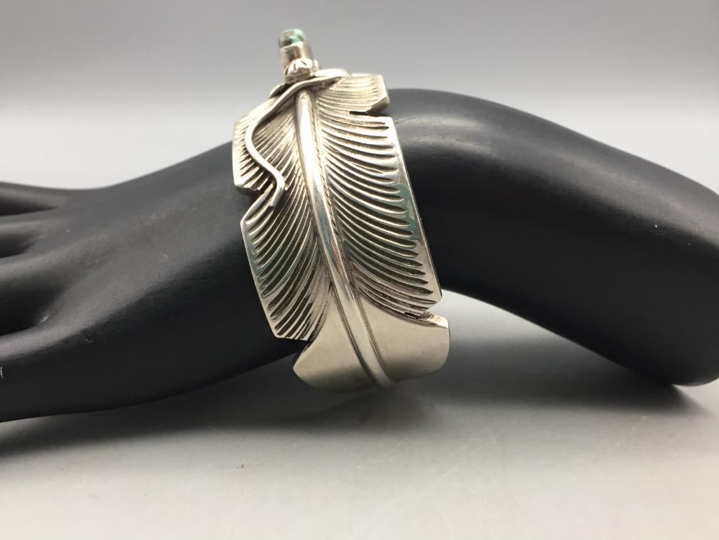 Presented for sale in this lot is a unique sterling silver bracelet created to look like a feather. It has a small green turquoise cabochon surrounded by sterling silver accents. Maker: Hallmarked CC. Approx. Age: Fairly modern. Size: Measures 5-3/4" with a 1-1/4" opening, fits a 7" wrist. It is 1' wide and weighs 81.1 grams. Condition: Good for its age, normal wear expected. Please look closely at the pictures - they are an important part of our description. Shipping: There will be a $5 handling / packaging fee for shipping this lot. The actual cost of postage will be added on top of that.