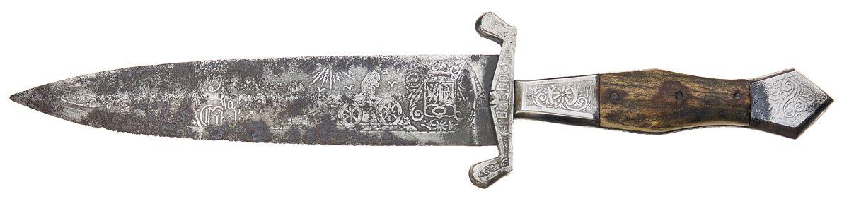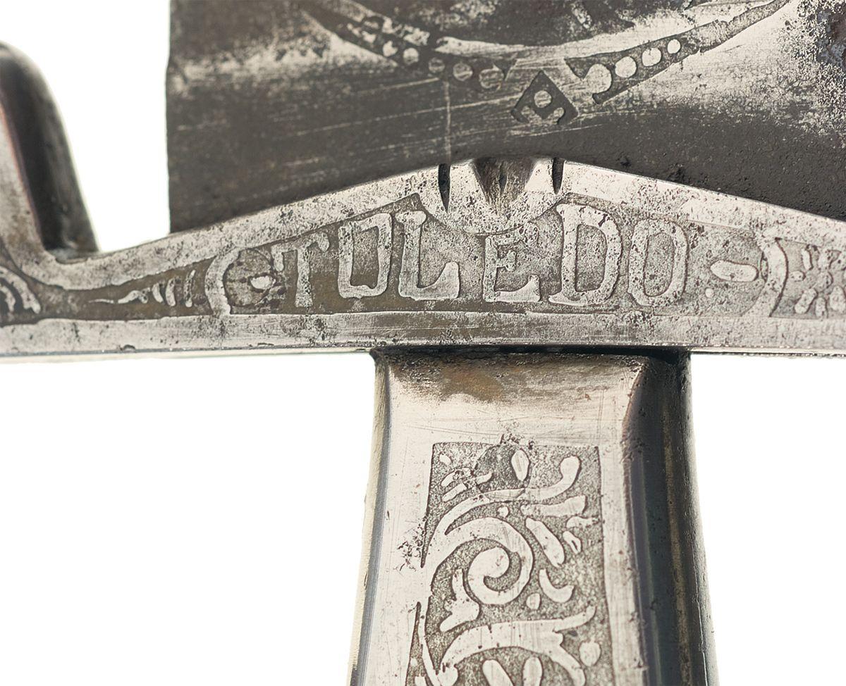 6 7/8" long and 1 1/3" wide spear tipped double edged blade with etched bowman scene, lion with chariot and untranslated writing. Dual quillion guard marked "TOLEDO", Full tang with etched accents, smooth contoured horn grips. Fair overall, with pitting on the blade, mixed gray patina and mild handling marks. Grips are good, with some mild dings.