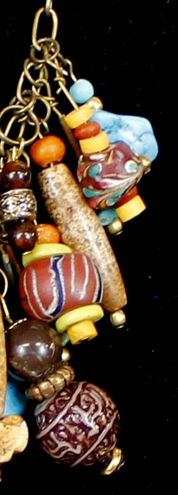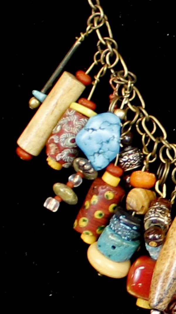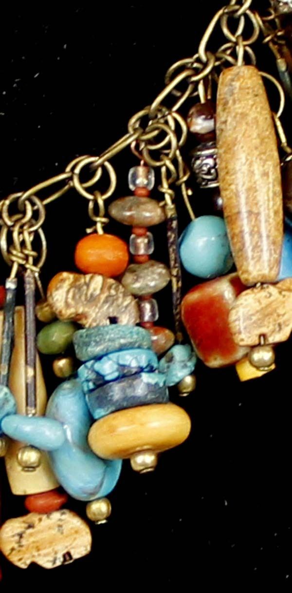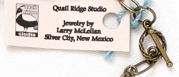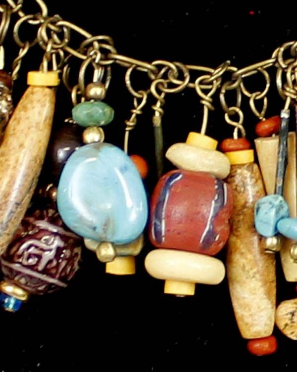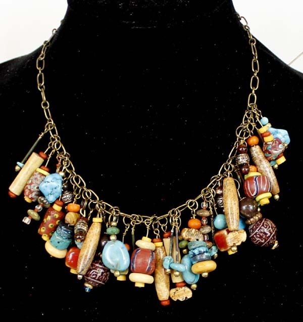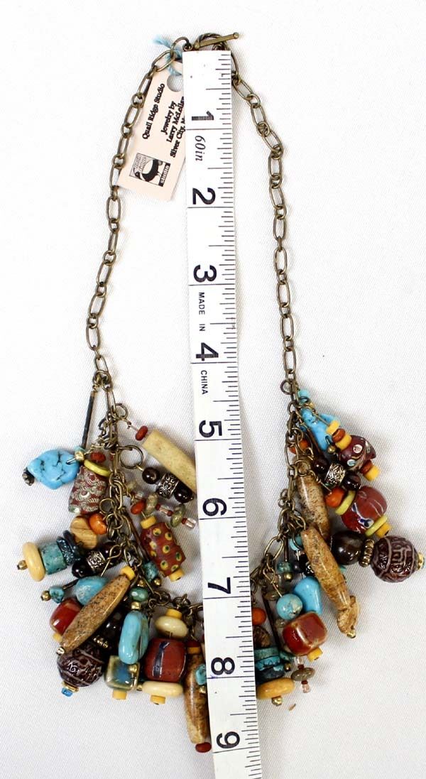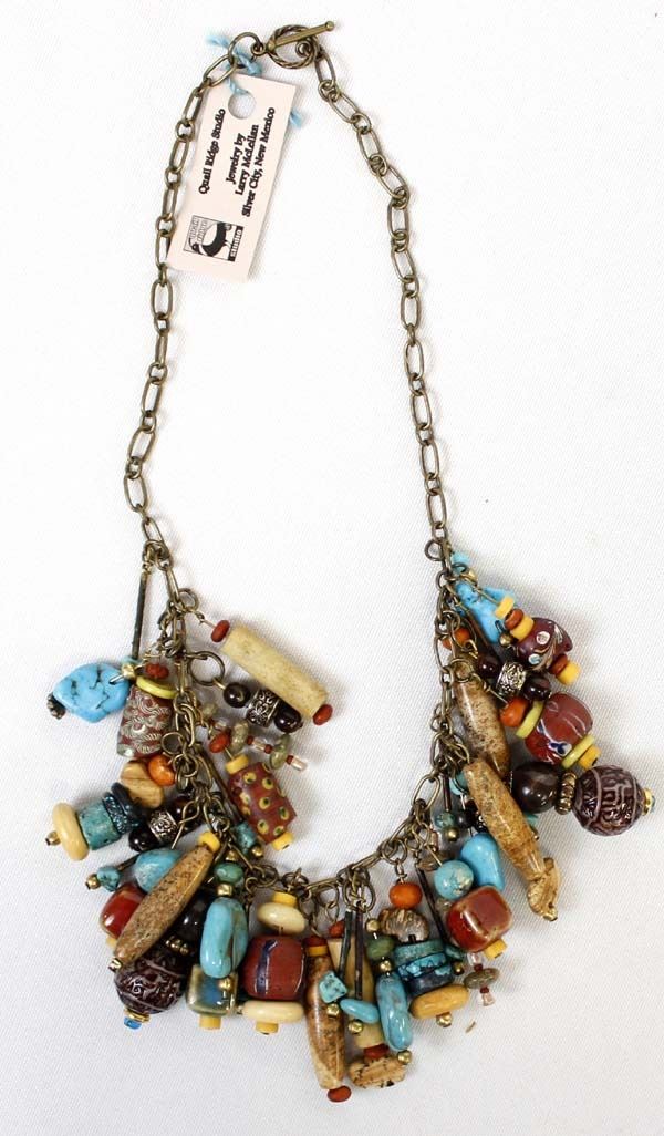 Unique ''Treasure'' Choker. features turquoise, bone, and glass beads which dangle from a chain that measures 12'' end to end. The magic of the Desert Southwest is timeless in its display of open landscapes, sunrise and sunset colors with infinite possibilities of artistic expression. The design studio of Quail Ridge was founded on these possibilities, forging an endless variety of earthen gems to their metallic counterparts. The artist, Larry McLellan, designs jewelry contemporary in style, while maintaining elements of native designs.