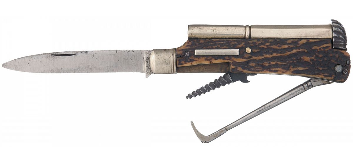 The 3 1/4" inch blade is marked "REST/STEEL". The blade marking is the only marking on the pistol. Folding cork screw trigger and raised relief clam shell pattern hammer. The pistol also has a folding curved pick. The pistol and knife are enclosed within a brass case with German silver bolsters at the front. The scales have provisions for a tool (pick included) on the left side at the butt.