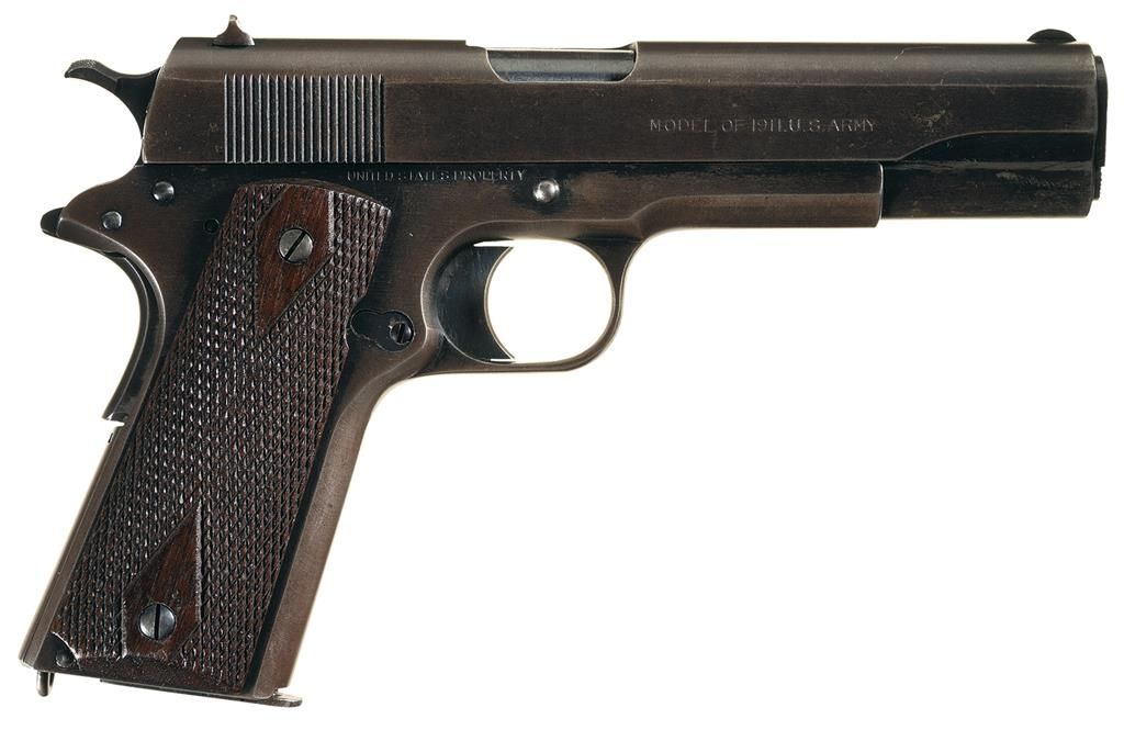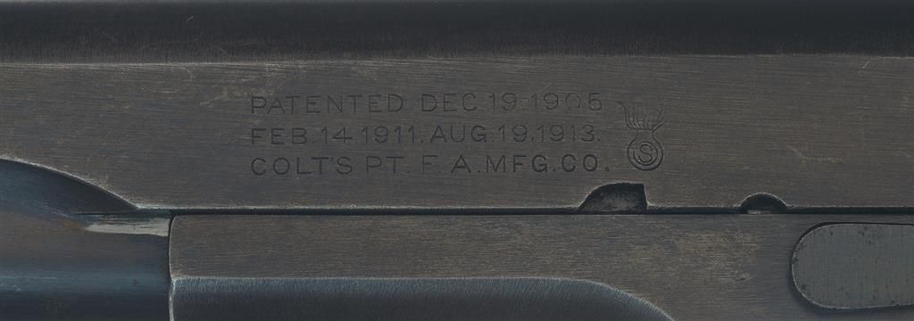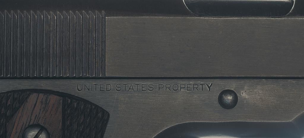 Produced without a serial number or government acceptance markings. The frame is nearly devoid of markings, save "UNITED STATES PROPERTY" on the right side and "H" on top ahead of the disconnector, the preliminary inspector's mark of Frank Hosmer, Colt Inspector, with the slide bearing the three-line patent and "S" in flaming bomb markings attributed to the Savage Firearms Company along with the non-serifed "MODEL OF 1911.U.S.ARMY" on the right. Long smooth hammer, checkered wide hammer, slide stop and thumb safety, short grip safety, smooth mainspring housing, diamond flats on the grip panels, "R" marked two-tone magazine, and a conjoined "HP" barrel. The circumstances behind this combination of components are unknown; the frame may have been supplied to Savage by Colt as a tool room model, or may have been a "lunch box gun" that was 'liberated' by an employee one-piece at a time. Additionally, the rear section of the top of the frame around the hammer shows a more convex profile than is typically seen on Colt 1911 frames of the World War I/Inter-War Era, another anomaly we have no concrete explanation for, other than quite possibly to be used as a production sample.