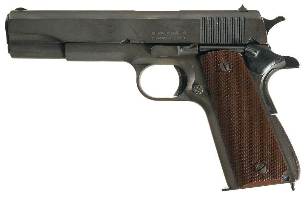 Manufactured in 1943, as the 45th pistol in the first serial number block assigned to Remington-Rand for wartime production of the Model 1911A1 Pistol. This particular example lacks the Atwood "FJA" proof and the Ordnance "crossed cannon" stamp. The cause of this is unknown; the pistol may have been made to serve as a company reference piece/tool room model, it may have been a piece that was rejected, or any number of other scenarios. Serrated blade front and flat top notch rear sights, with the desirable, second pattern slide markings of: "REMINGTON RAND INC./SYRACUSE, N.Y. U.S.A.", with the "P" proof on top and a "P" proof marked frame with a stamped trigger, thin hammer, checkered mainspring housing and slide catch, Keyes Fiber grips and a High Standard barrel.