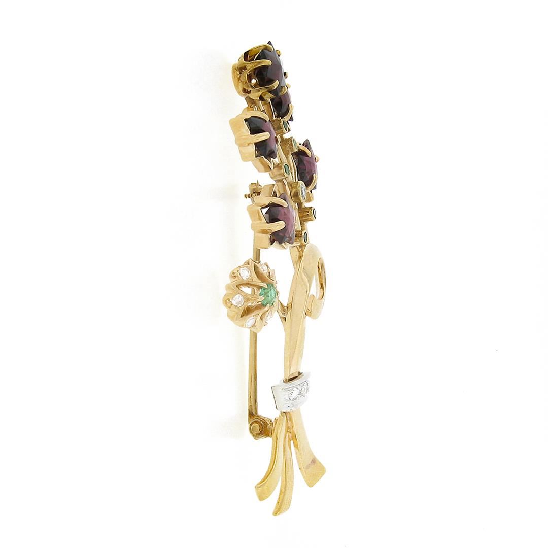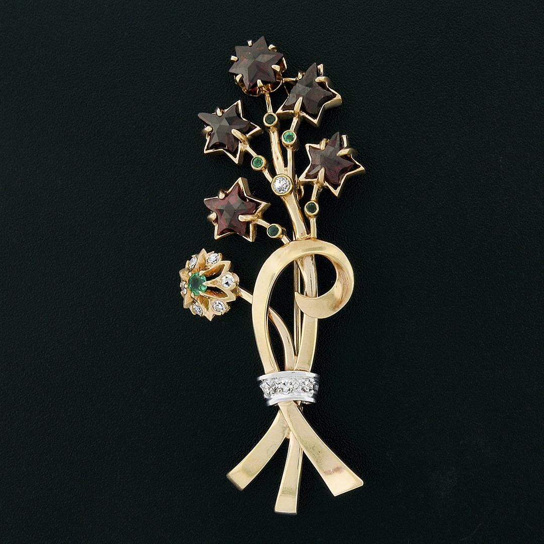 Unique Vintage 14k Gold Custom Star Garnet Emerald Diamond Bundle Bouquet Brooch