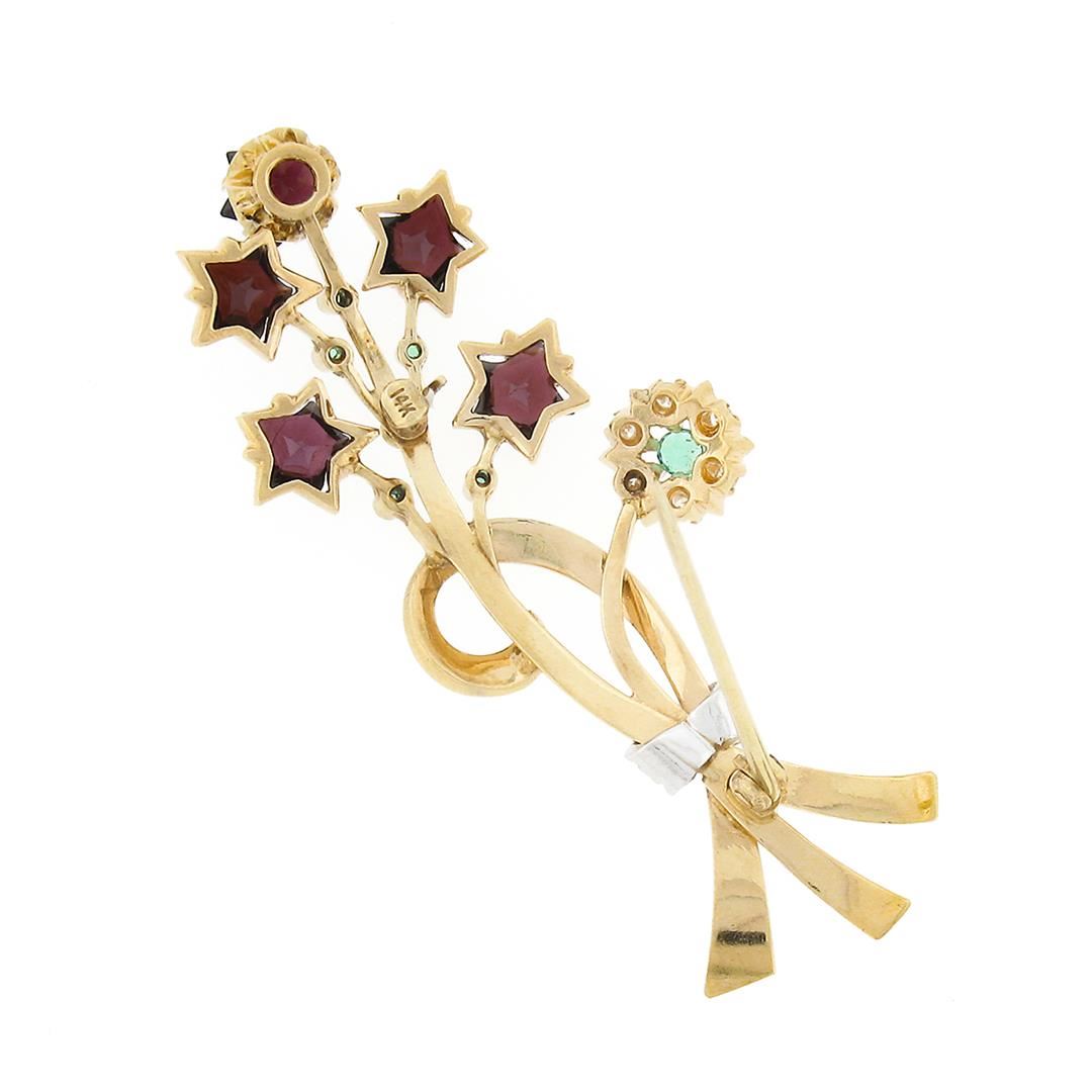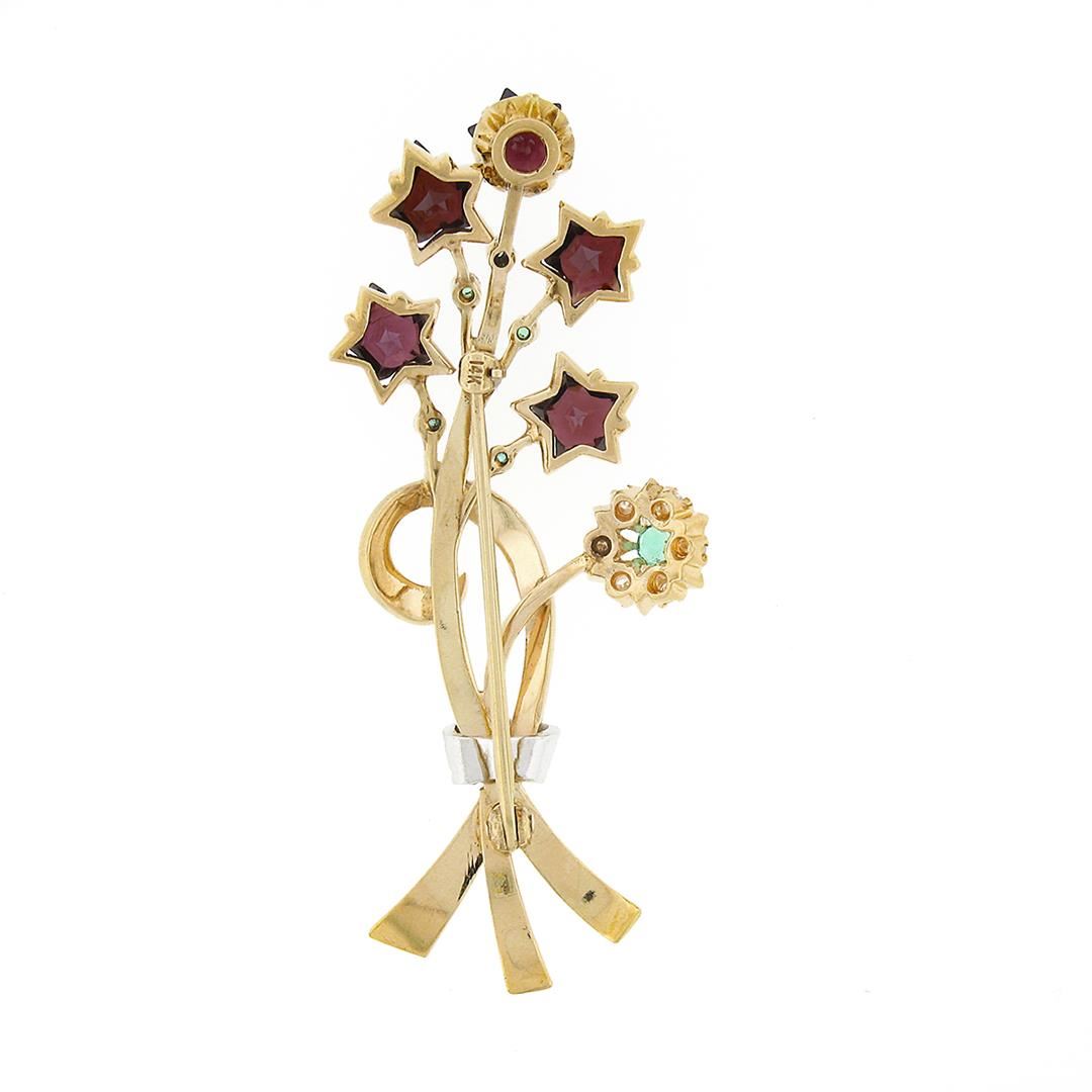 Unique Vintage 14k Gold Custom Star Garnet Emerald Diamond Bundle Bouquet Brooch