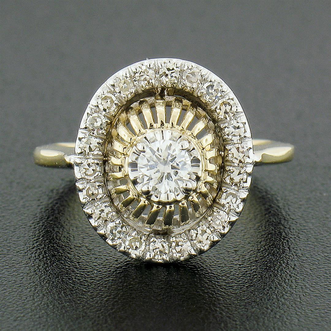 A solid 14k yellow and whte gold ring, with 1 old transitional cut natural diamond (F - SI1 ; 0.22ct), surrounded with a halo of 22 old single cut natural diamonds (G/H - VS1/VS2 ; 0.35ctw). The ring is size 5.5, weighs a total of 4.12 grams, and measure