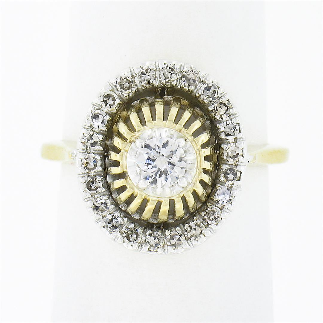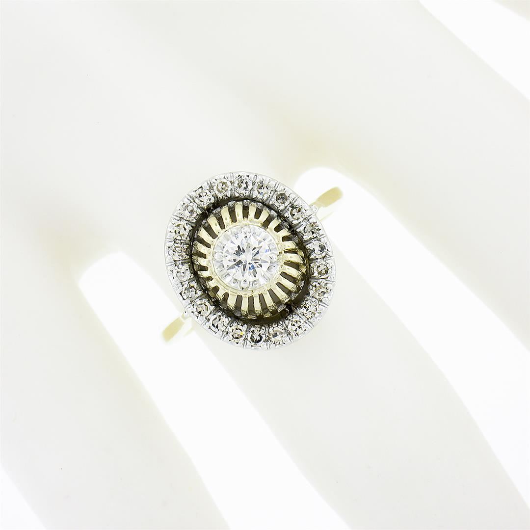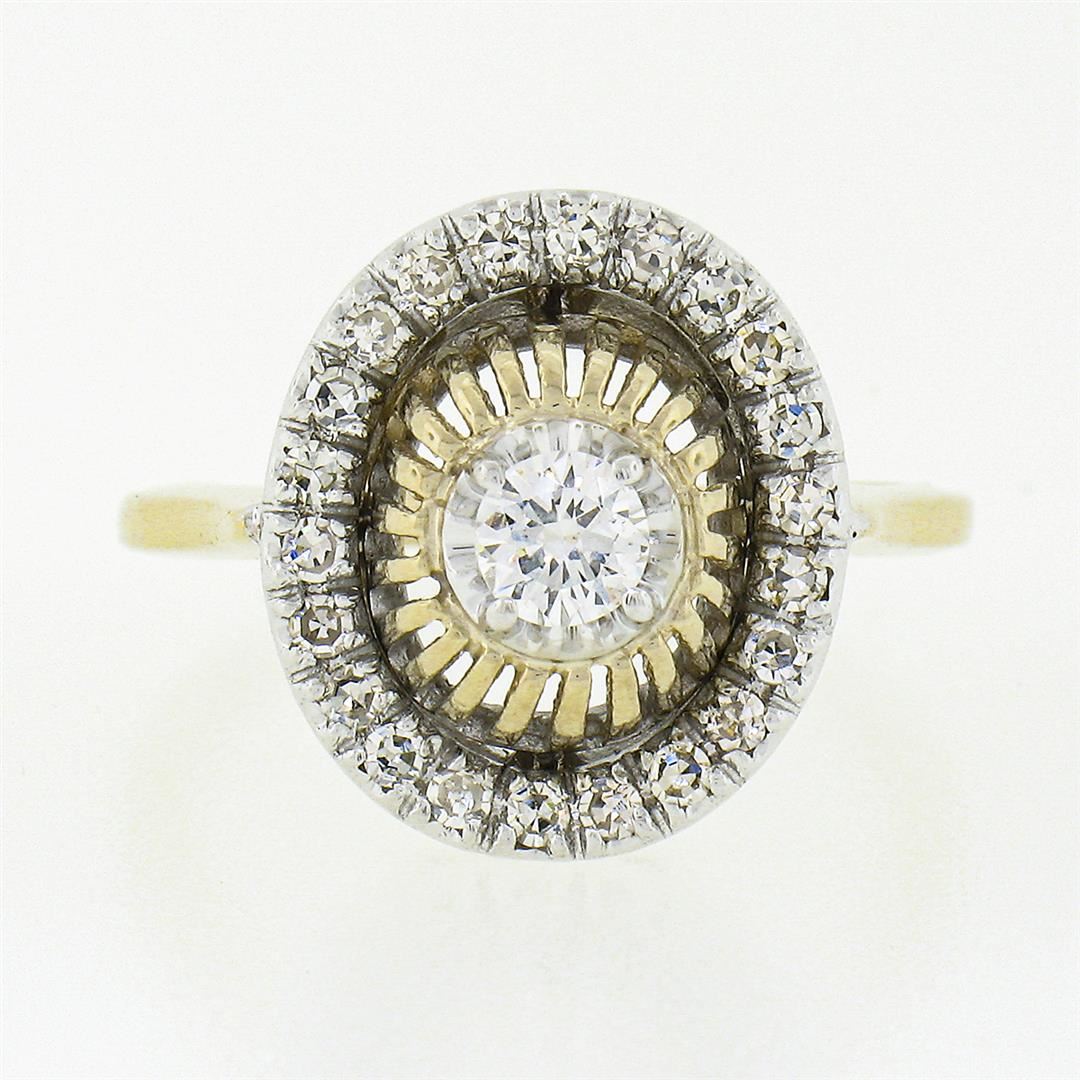 A solid 14k yellow and whte gold ring, with 1 old transitional cut natural diamond (F - SI1 ; 0.22ct), surrounded with a halo of 22 old single cut natural diamonds (G/H - VS1/VS2 ; 0.35ctw). The ring is size 5.5, weighs a total of 4.12 grams, and measure