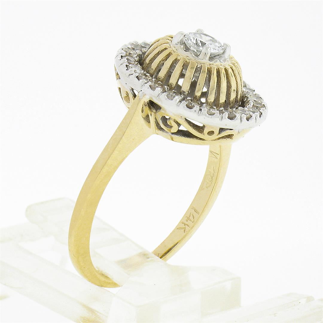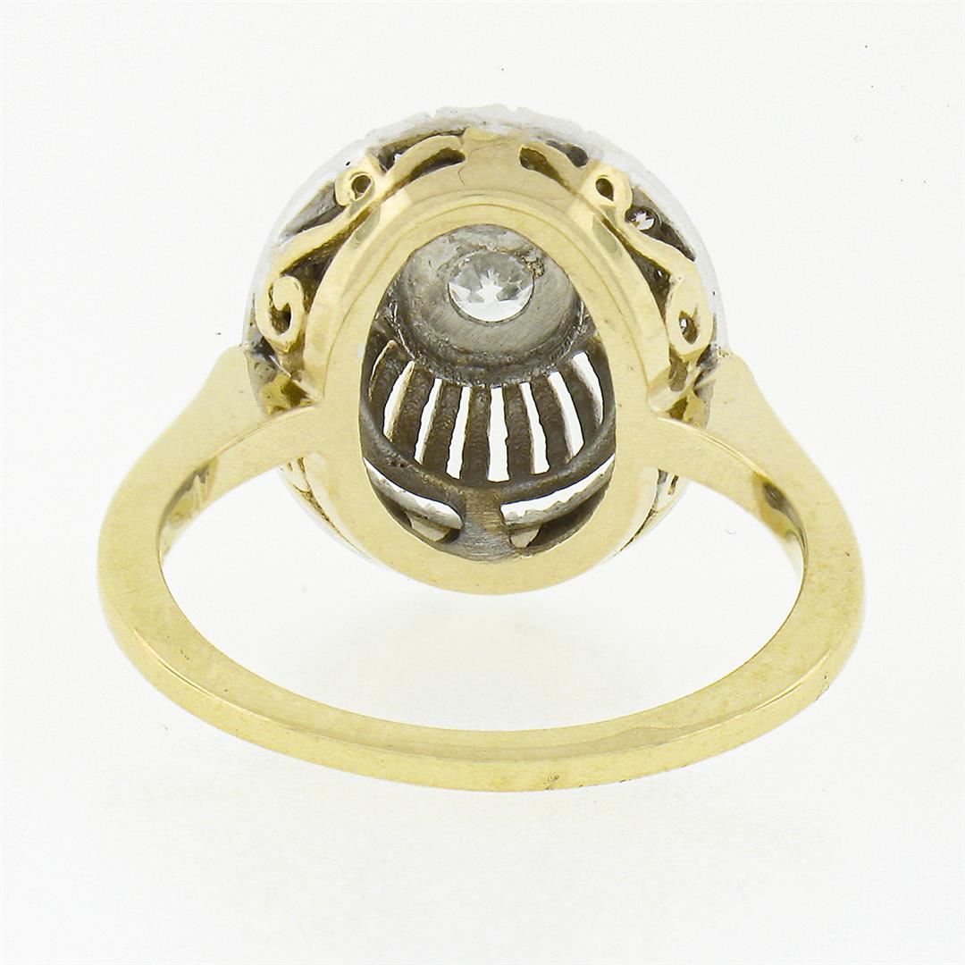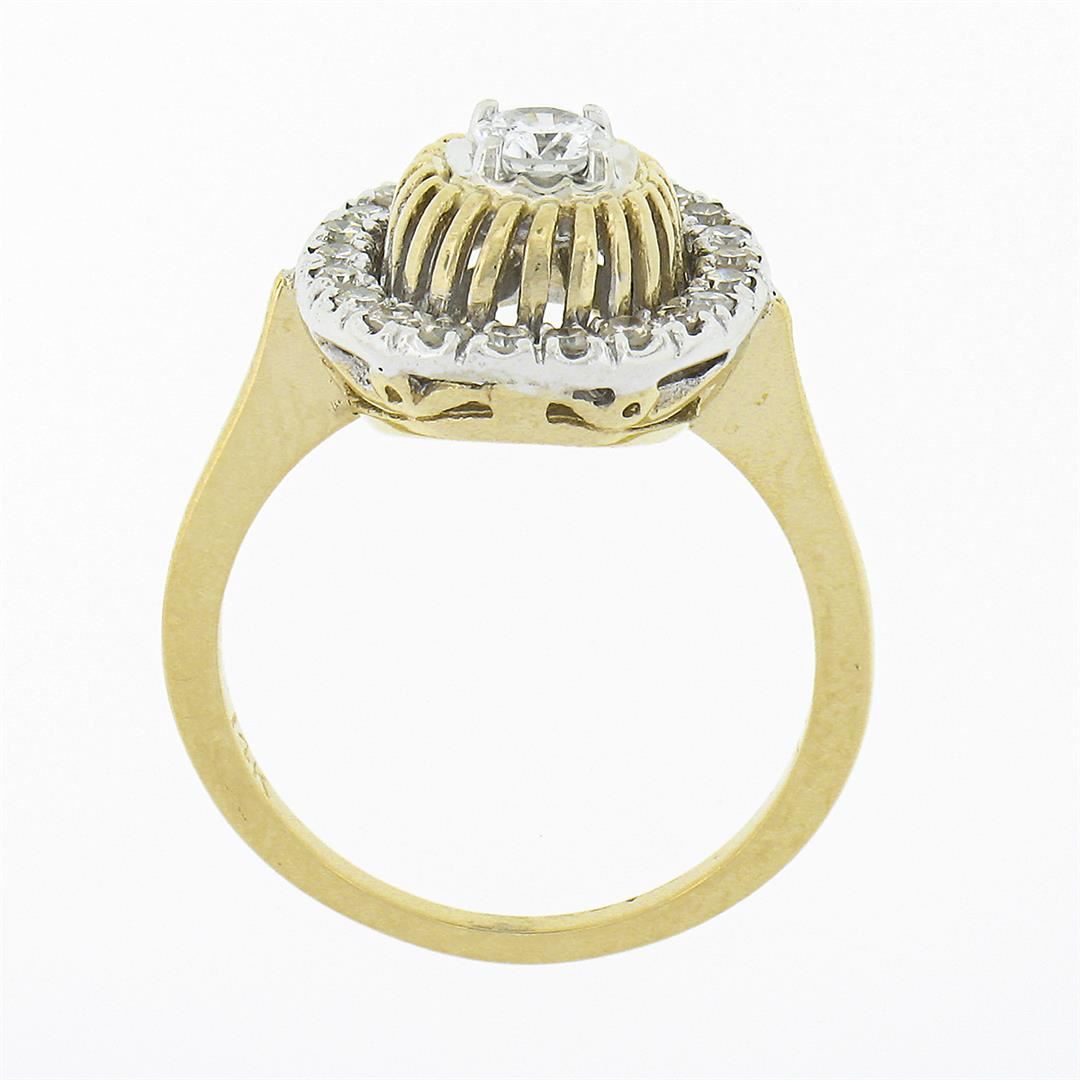A solid 14k yellow and whte gold ring, with 1 old transitional cut natural diamond (F - SI1 ; 0.22ct), surrounded with a halo of 22 old single cut natural diamonds (G/H - VS1/VS2 ; 0.35ctw). The ring is size 5.5, weighs a total of 4.12 grams, and measure