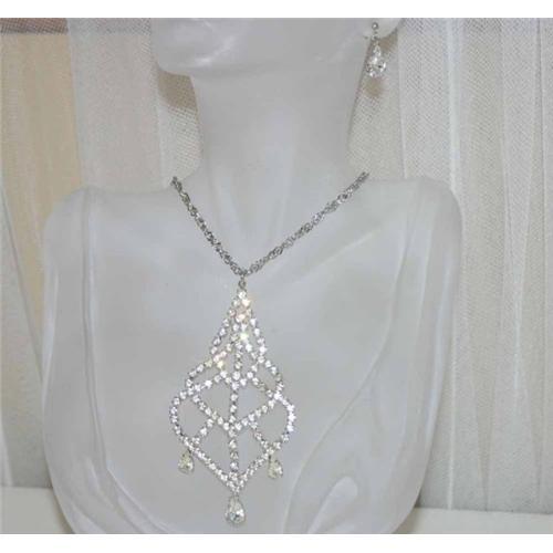This is a very old 1930s vintage Rhinestone Necklace pendant with matching pierced Earrings. All Rhinestones are prong set in a flexible silver rhodium plated, closed back setting. Three large pear shaped Rhinestones adorn the bottom of the pendant and are an exact match to the dangle pierced Earrings. The Pendant measures 4 inches long by 2 inches wide and is attached to an fancy link, 18 inch long silver metal chain that secures with a spring-ring closure. The Earrings measure ¾ of an inch long. Unusual, feminine and absolutely beautiful!