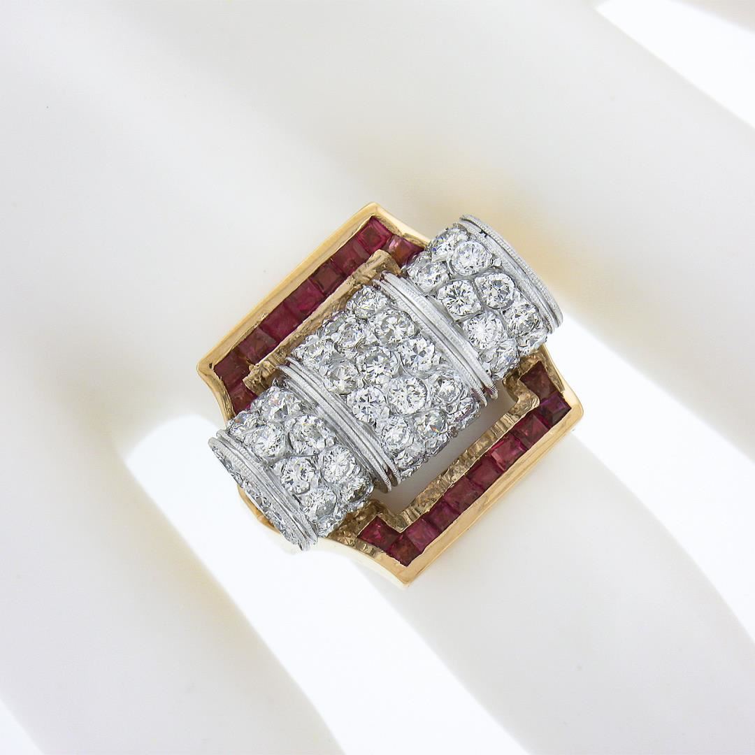 A vintage solid 14k yellow gold & platinum insert ring set, with 75 old trsansitional cut natural diamonds (G/I - VS2/I1 ; 2.15ctw), and 20 square step cut natural rubies (0.60ctw). The ring is size 6.5, weighs a total of 8.91 grams, and measures 17mm wide.