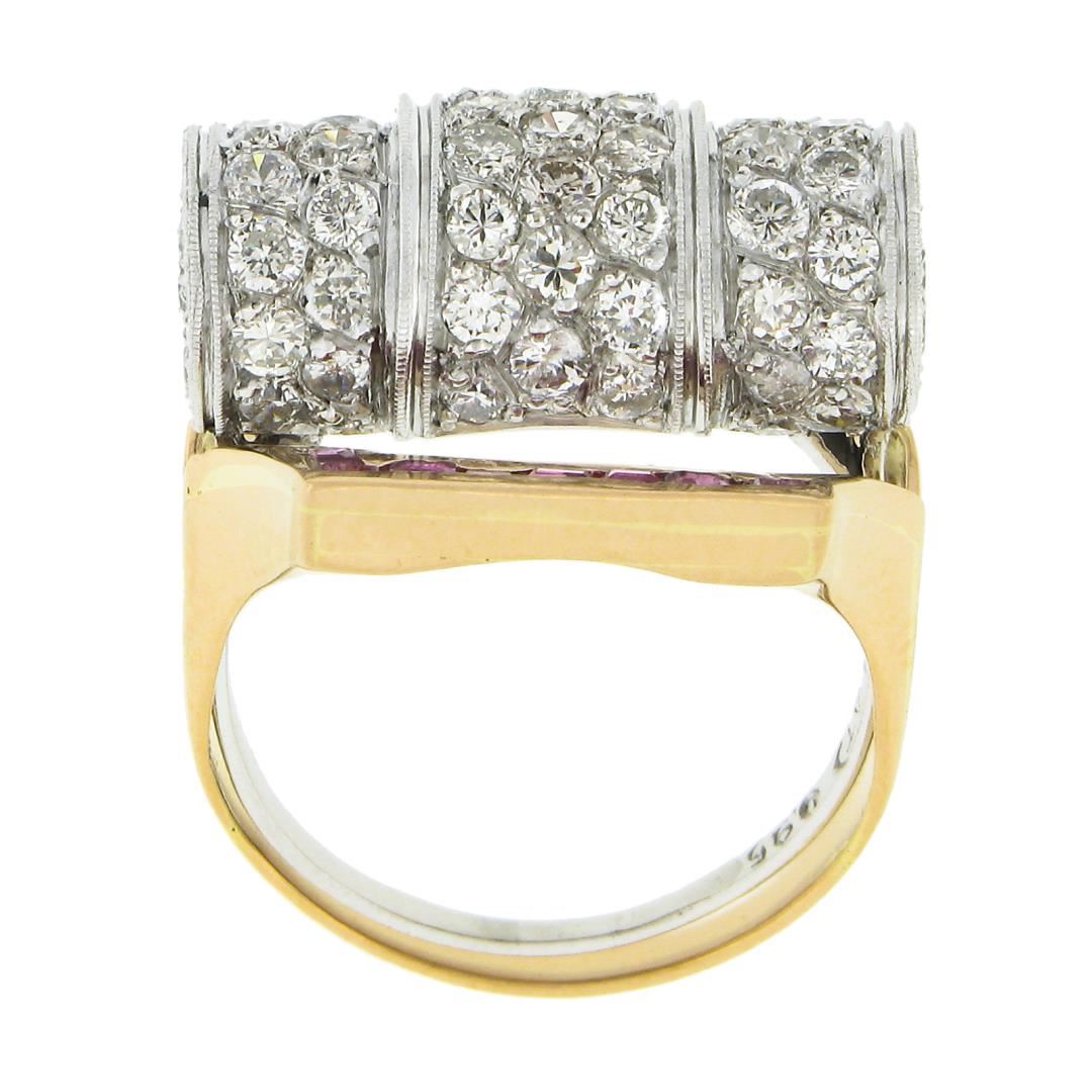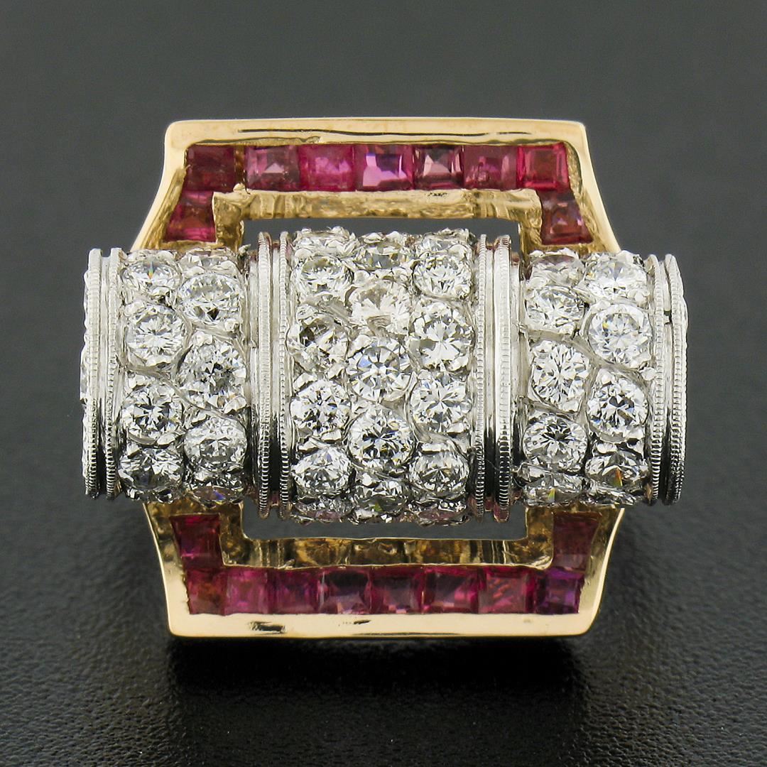 A vintage solid 14k yellow gold & platinum insert ring set, with 75 old trsansitional cut natural diamonds (G/I - VS2/I1 ; 2.15ctw), and 20 square step cut natural rubies (0.60ctw). The ring is size 6.5, weighs a total of 8.91 grams, and measures 17mm wide.