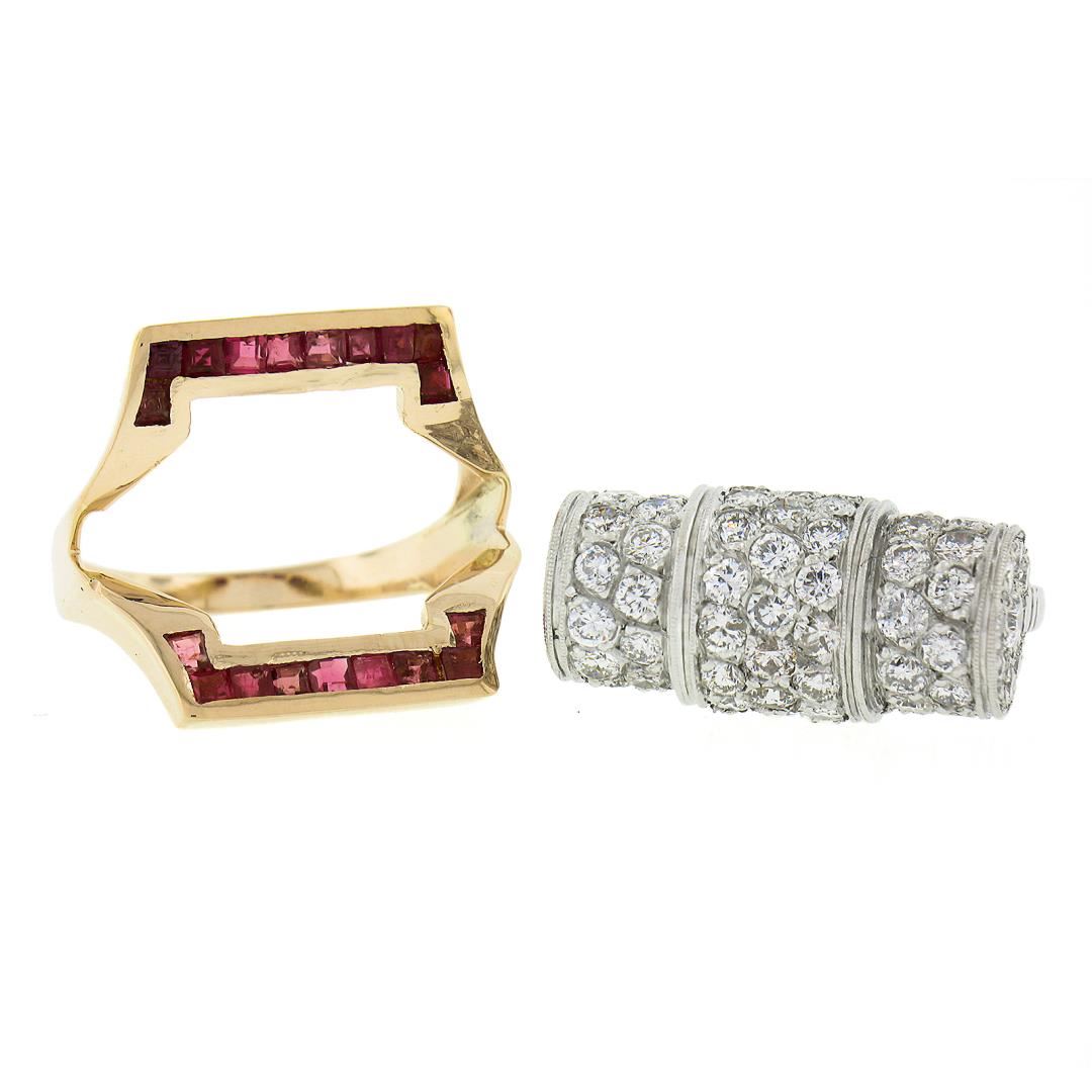 A vintage solid 14k yellow gold & platinum insert ring set, with 75 old trsansitional cut natural diamonds (G/I - VS2/I1 ; 2.15ctw), and 20 square step cut natural rubies (0.60ctw). The ring is size 6.5, weighs a total of 8.91 grams, and measures 17mm wide.