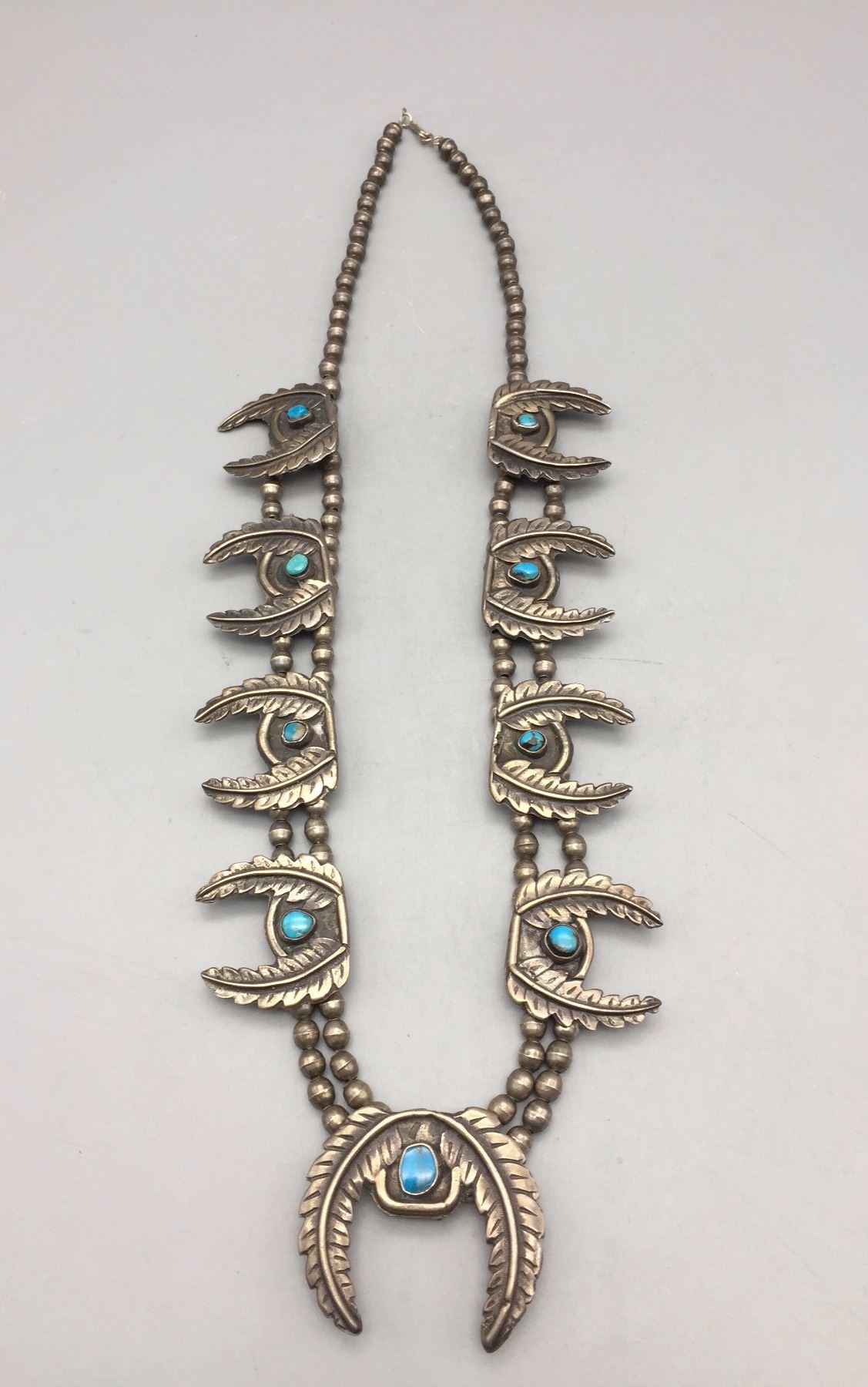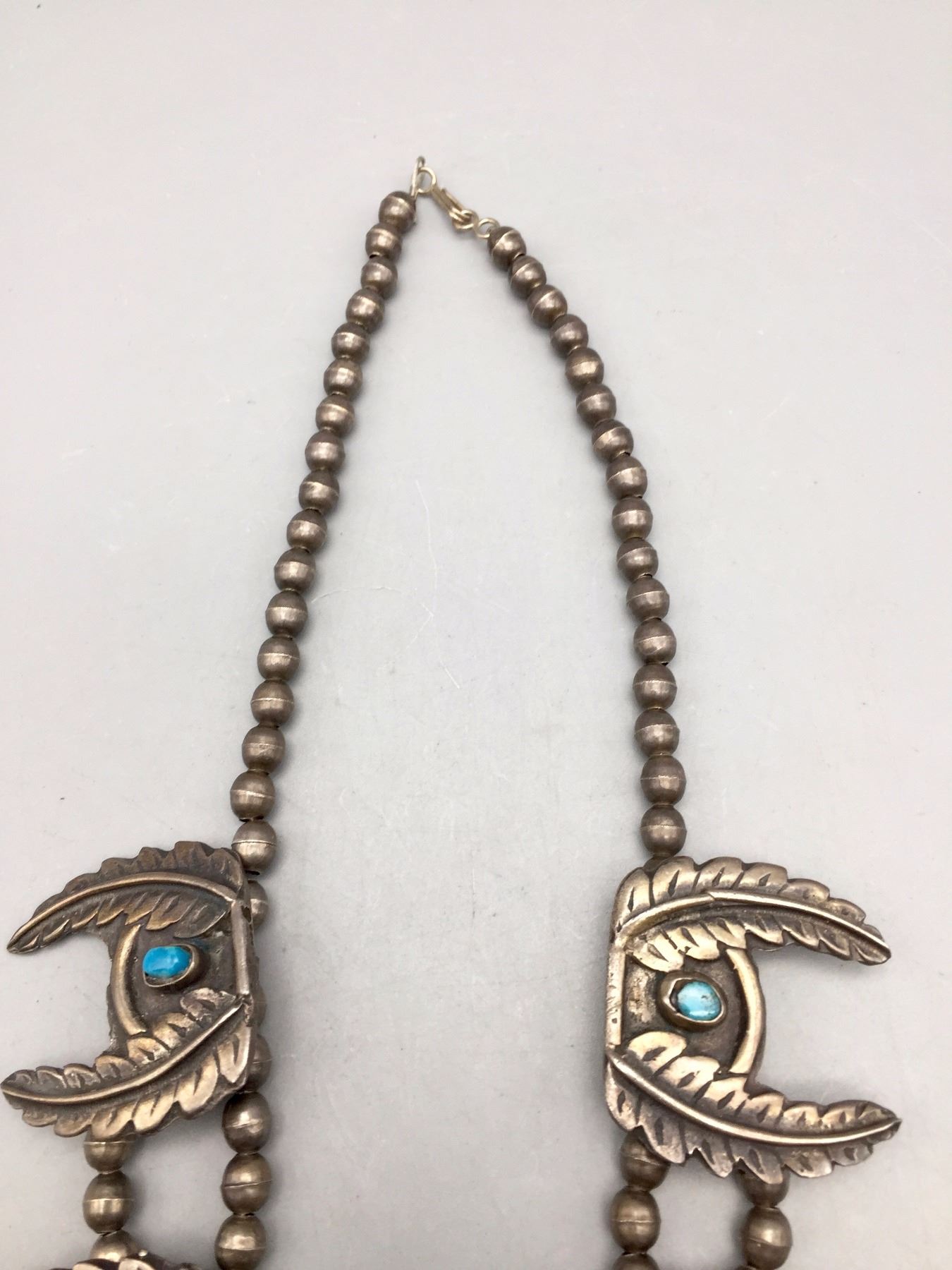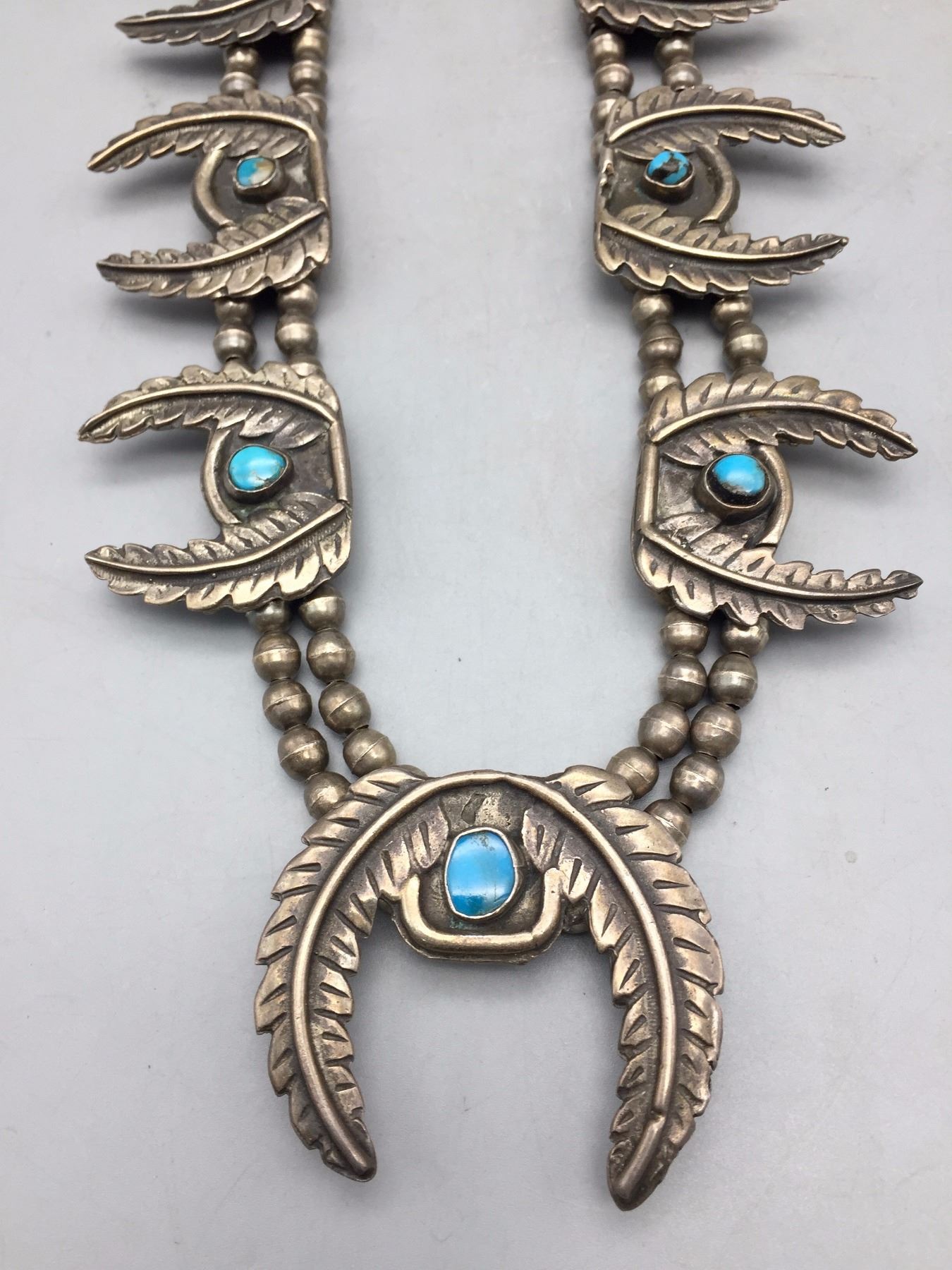 Description: Very unique, vintage squash style turquoise and sterling silver necklace. Maker: No hallmark. Approx. Age: Circa 1960s - 70s. Size: Fits a 24” neck. Pendant measures 2”w x 1-3/4”h. Weighs 180.2 grams. Condition: Good for its age, normal wear expected. Please look closely at the pictures - they are an important part of our description. Shipping: There will be a $5 handling / packaging fee for shipping this lot. The actual cost of postage will be added on top of that.