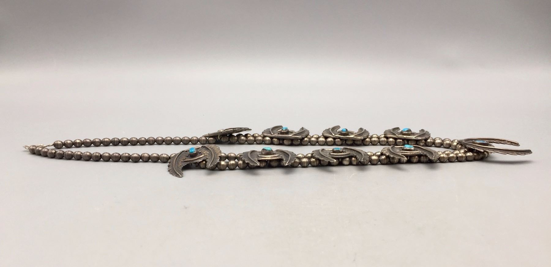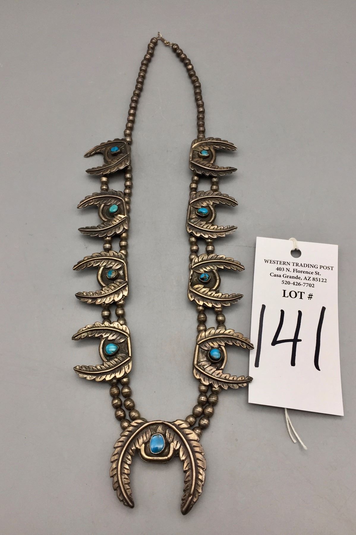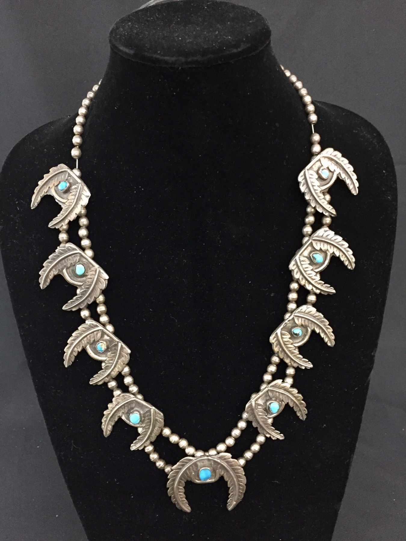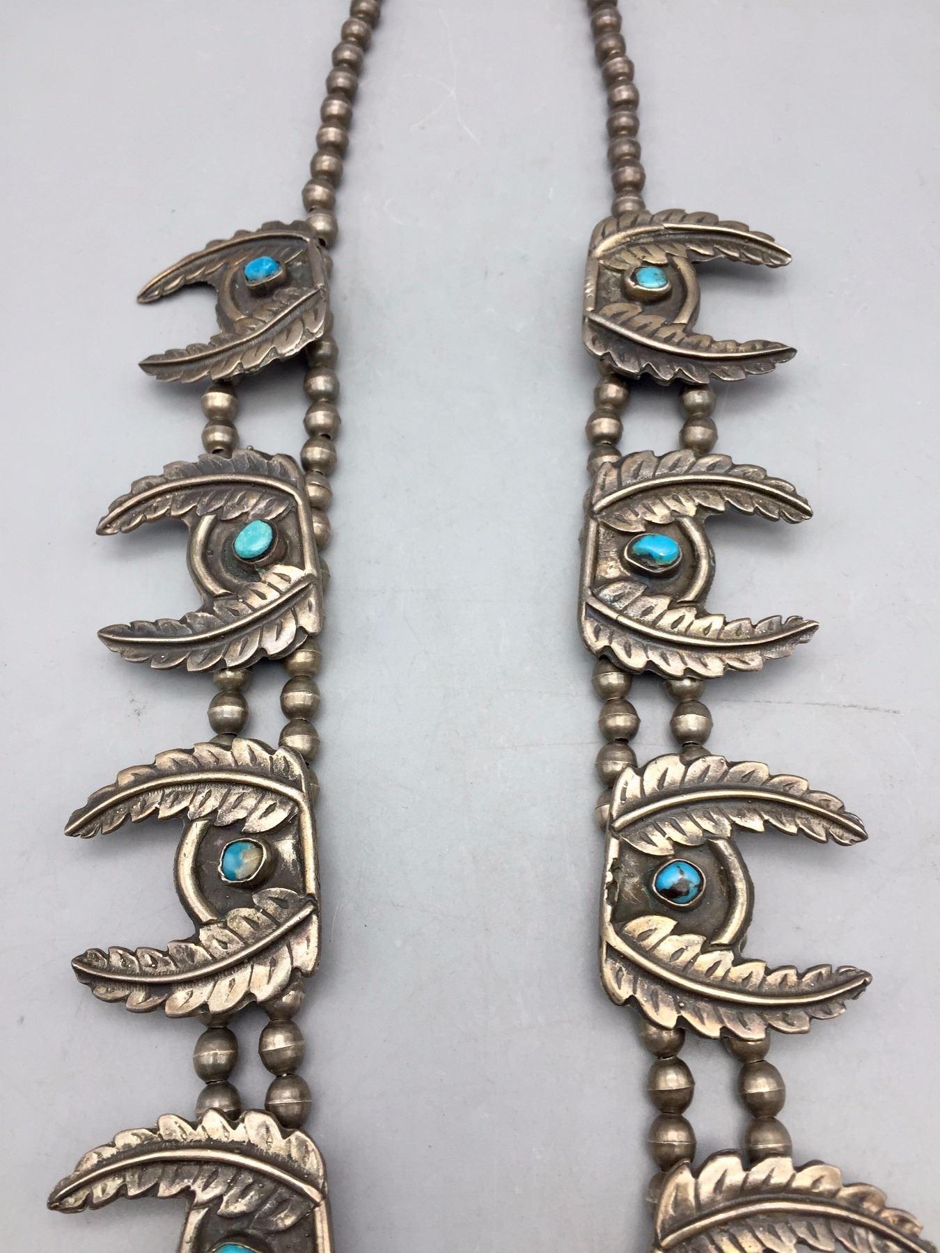 Description: Very unique, vintage squash style turquoise and sterling silver necklace. Maker: No hallmark. Approx. Age: Circa 1960s - 70s. Size: Fits a 24” neck. Pendant measures 2”w x 1-3/4”h. Weighs 180.2 grams. Condition: Good for its age, normal wear expected. Please look closely at the pictures - they are an important part of our description. Shipping: There will be a $5 handling / packaging fee for shipping this lot. The actual cost of postage will be added on top of that.