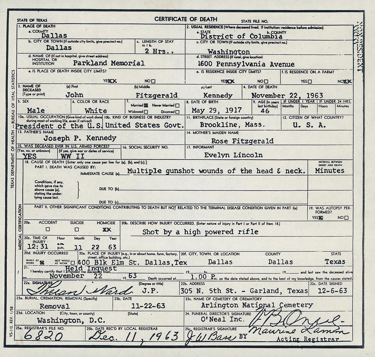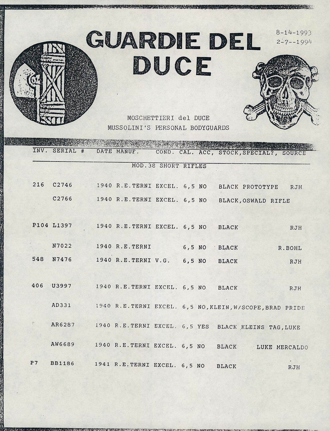 Blade front and notch rear sights, with caliber markings on the rear sight base and "crown/ RE/ TERNI" on the chamber next to "1940 XVIII/ MADE IN ITALY" and the serial number. Bolt is marked with a circular "SD" stamp, and is turned to accommodate the scope, an Ordnance Optics 4x18 in a sheet metal mount marked "NO 2 JAPAN". Smooth darkened straight grip stock, with a grooved forearm to accommodate a folding knife bayonet (not included), two piece black leather sling, and a smooth metal buttplate with storage compartment. Ordered from Klein's Sporting Goods of Chicago under the alias Alek Hidell, Oswald's Model 38 Carcano was delivered fitted with a similar black leather sling, Ordnance Optics scope, and dark stock finish. Following a legal dispute over the ownership of the rifle, due to Oswald's widow Marina selling her rights to it after the assassination, the carbine was declared government property, and now sits in the National Archives and Record Administration Building in Maryland. Included with this lot is 4 en-block clips (3 blue, one brass, the latter dated "953", like the one in Oswald's), 6 loose rounds of ammunition, one box of Western Cartridge Lot WCC-6000 ammunition, and a grouping of papers relating to the Kennedy Assassination in general and the Carcano in particular, including several copies of Life magazine. Also a list of serial numbers and configurations of other Carcano Rifles from the infamous shipment.
