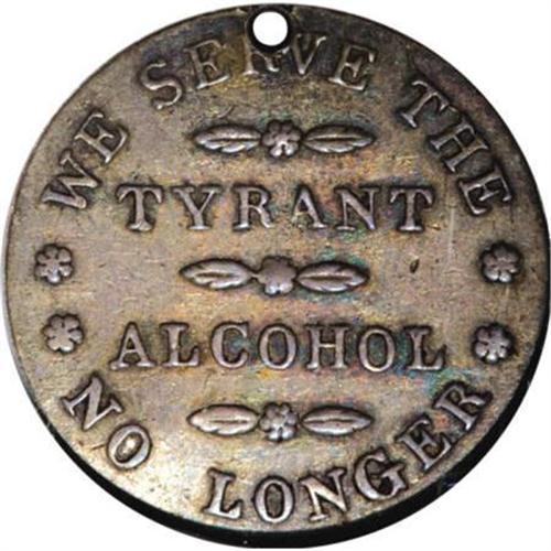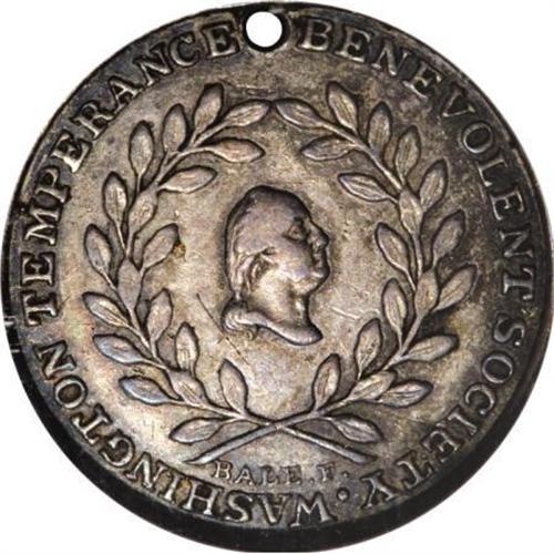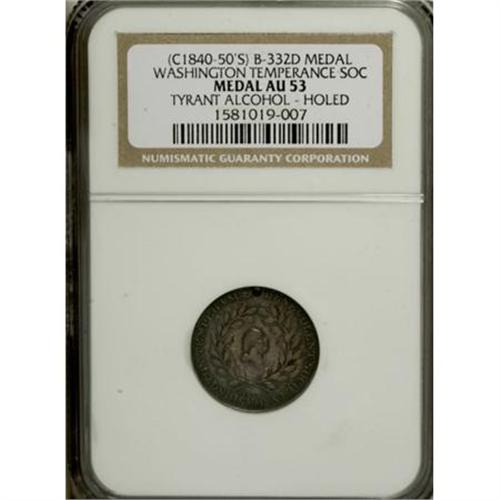<B>Washington Temperance Benevolent Society NGC AU53.</B></I> Baker-332D. Silver, plain edge, 20mm. The present lot is the only known <B>plain edge </B></I>example of this temperance medal. The silver, reeded edge equivalent is also extremely rare, listed as R.8 by Rulau. Engraved by James Bale, who was active during the 1830s and 1840s. Holed as issued near 12 o'clock, otherwise a lightly handled piece with pearl-gray and aqua toning.<BR><BR><b>Shipping:</b> Coins & Currency (<a target="_blank" href="http://www.heritageauctions.com/common/shipping.php">view shipping information</a>)