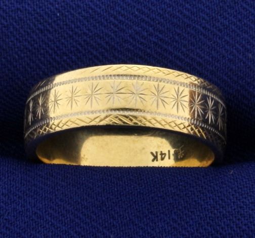 In 14k yellow and white gold. Very unique pattern. Size 7 3/4. 6.25mm wide and 1.38mm thick. 5.9g.