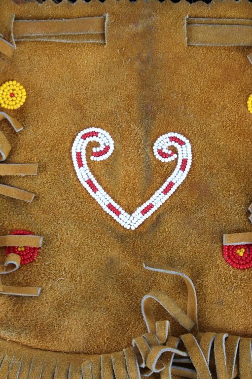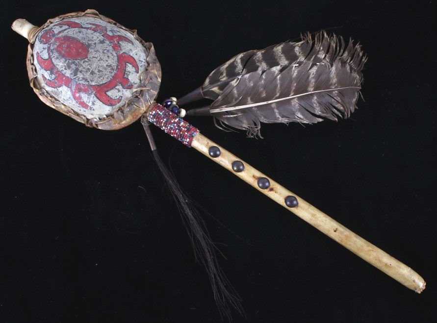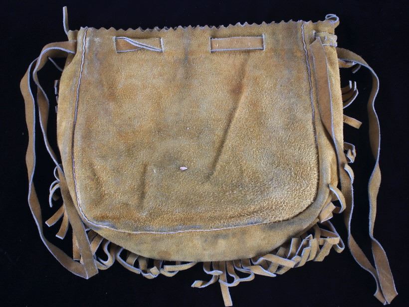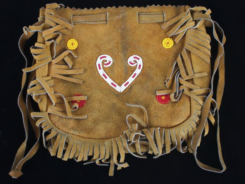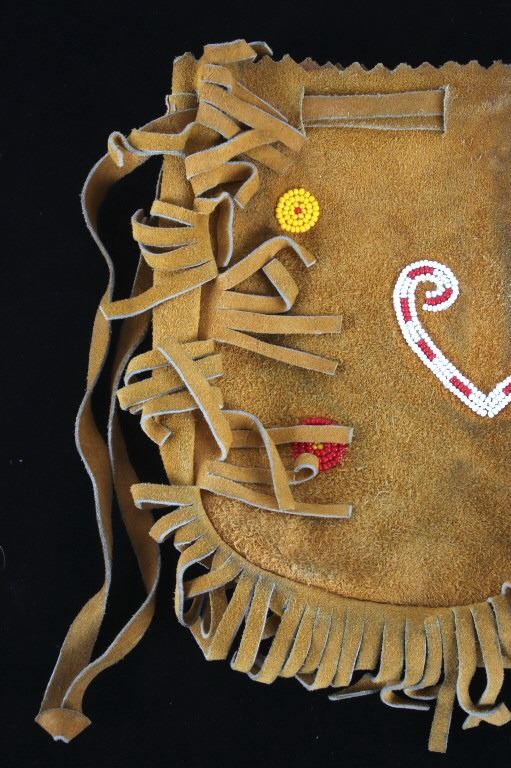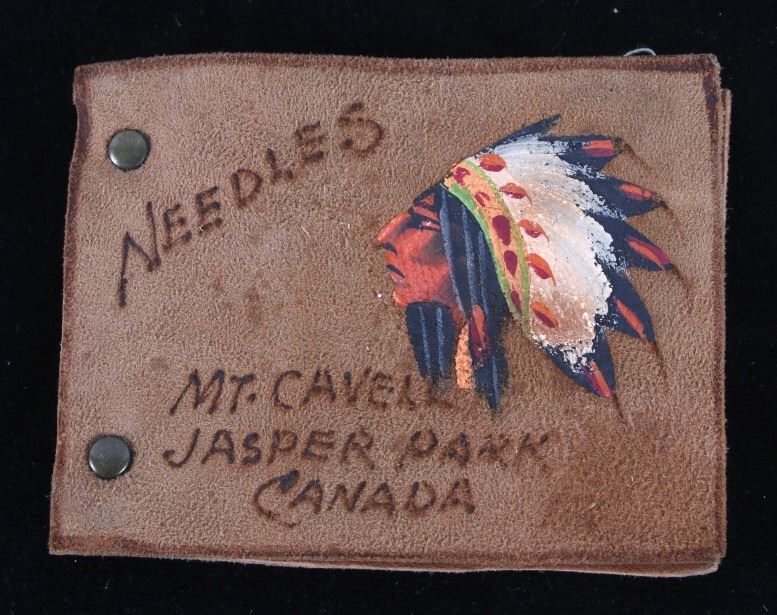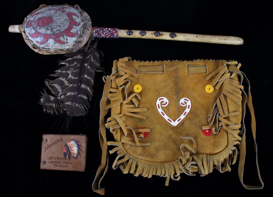 Offered in this lot is a collection of western themed items. The first item is a turtle shell rattle. The rattle is made of half a turtle shell and rawhide on a leather covered wand. There are seed beads at the joining of the shell to the wand and two turkey feathers and one horse hair tassel. The wand measures 19". The rawhide on the back of the rattle is cracked. The next item is a suede leather fringed and beaded bag. The bag measures 9" x 9" with 2" fringe. The bag has a drawstring closure. On one side of the bag is beading of four circles in yellow and red and a red open heart. The lining inside the bag is hand sewn cotton cloth with prints of the Hawaiian Islands. Next is a leather and cloth needle holder from Mt. Cavell, Jasper Park, Canada. The cover has a hand painted Indian chief in headdress on the cover. Inside are three pieces of felt with needles. These items are all in good to fair condition.