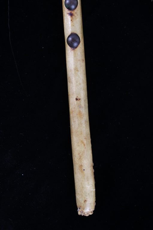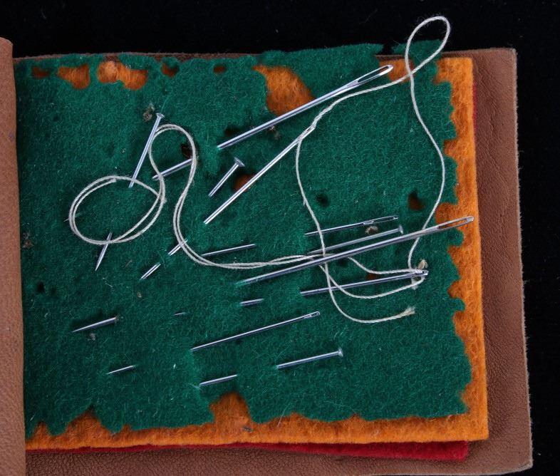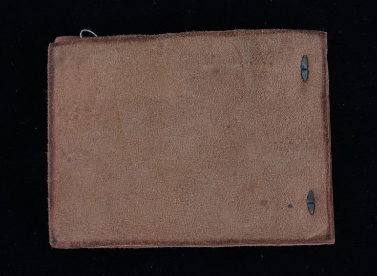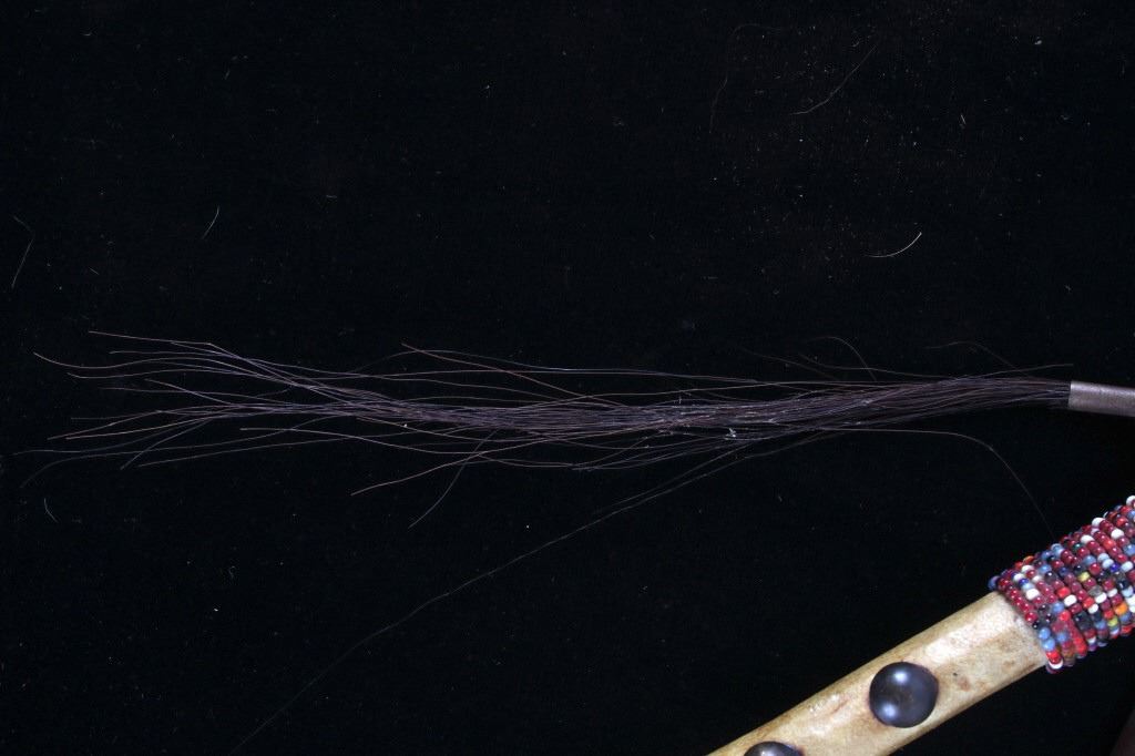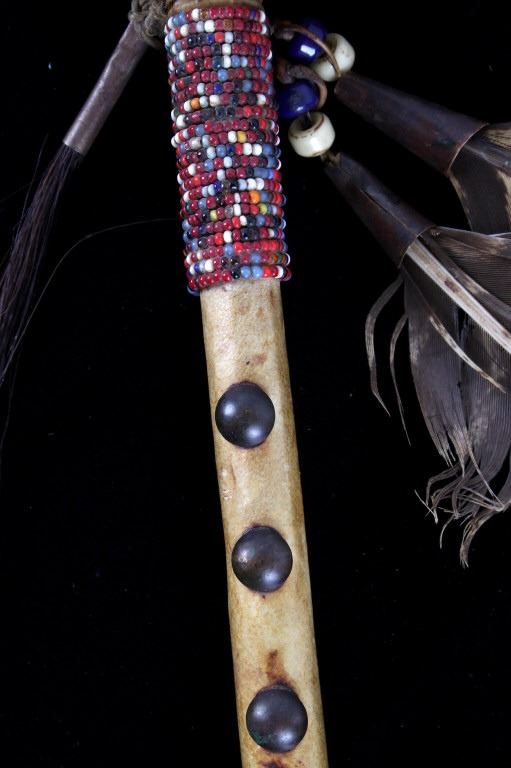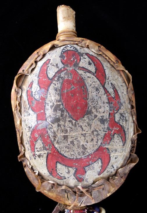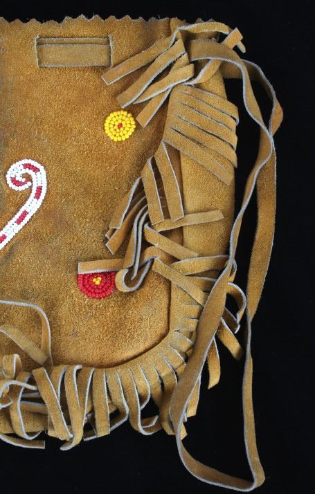 Offered in this lot is a collection of western themed items. The first item is a turtle shell rattle. The rattle is made of half a turtle shell and rawhide on a leather covered wand. There are seed beads at the joining of the shell to the wand and two turkey feathers and one horse hair tassel. The wand measures 19". The rawhide on the back of the rattle is cracked. The next item is a suede leather fringed and beaded bag. The bag measures 9" x 9" with 2" fringe. The bag has a drawstring closure. On one side of the bag is beading of four circles in yellow and red and a red open heart. The lining inside the bag is hand sewn cotton cloth with prints of the Hawaiian Islands. Next is a leather and cloth needle holder from Mt. Cavell, Jasper Park, Canada. The cover has a hand painted Indian chief in headdress on the cover. Inside are three pieces of felt with needles. These items are all in good to fair condition.