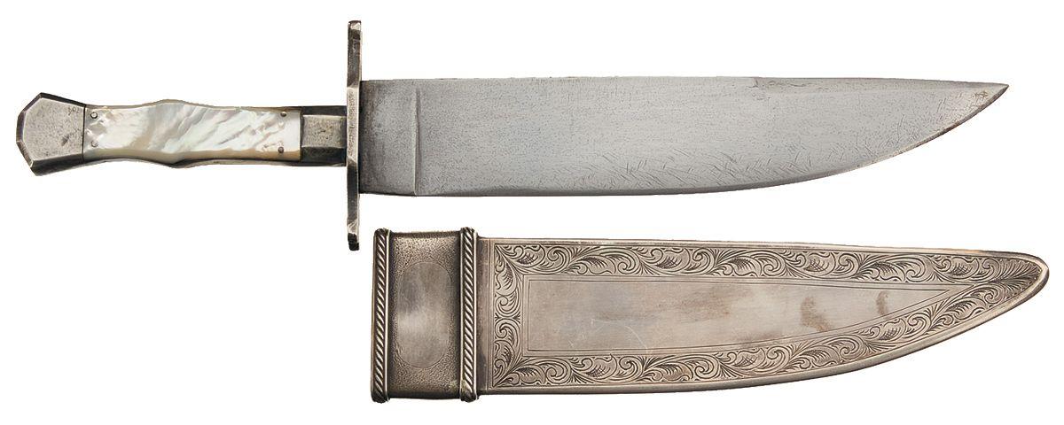 8 1/4" long, 1/5" thick and 1 9/16" wide blade, silver hilt with dual quillion guard, octagonal collar, gem-shaped pommel, and smooth mother-of-pearl grips. Silver finished brass sheath with engraving. Blade is fine, grips repaired, sheath excellent.