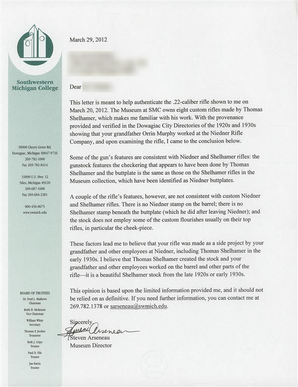 This unique Winchester Model 1890 Rifle has been attributed to employees working at the famed Niedner Rifle Co. in the early 1930s. Adolph Otto Niedner established himself as well respected American gunsmith who manufactured custom rifles for many noted riflemen including Townsend Whelen, Charles Newton and Ned Roberts. He opened the Niedner Rifle Company in Dowagiac, Michigan in 1920. This rifle was once the personal property of Orin Murphy, a Niedner Rifle Co. toolmaker circa 1920s-1930s. (Copies of the Dowagiac City Directories of the 1920s and 1930s are included with the lot.) This rifle was examined by Steven Arseneau, the director of the Southwestern Michigan College Museum. An included letter from Arseneau notes that this rifle has features that are consistent with Niedner and Thomas Shelhamer rifles. Arseneau explains that the stock has checkering consistent with work done by Shelhamer and "the buttplate is the same as those on Shelhamer rifles in the Museum collection, which have been identified as Niedner buttplates." Arseneau also notes that the rifle does not have a Niedner barrel stamp, is without a Shelhamer stamp which were used after he left Niedner and the stock does not feature custom flourishes usually associated with Shelhamer or Niedner rifles such as a cheekpiece. All these factors lead Arseneau to concluded that the rifle possibly was a "side project" done by Orin Murphy and other employees including Shelhamer in the early 1930s. The rifle is equipped with a rotating blade front sight and Lyman tang sight with the bolt cover tapped for sight mounting. As stated, there are no markings on the rifle. Mounted with a nicely figured forearm and pistol grip stock with multi-point checkering and a grip cap.