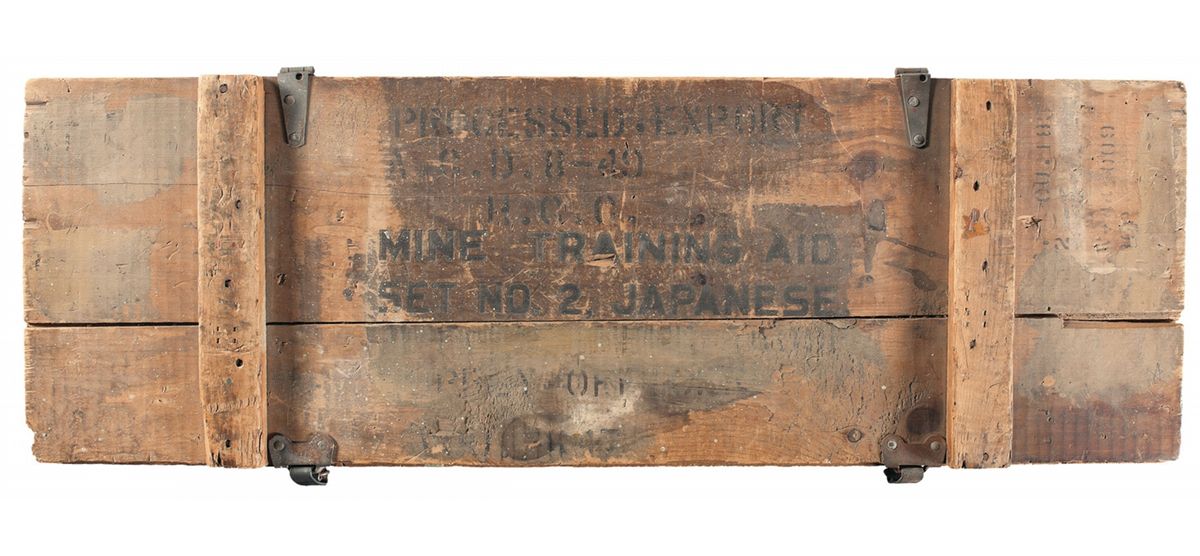 Packed in a hardwood crate, this kit was designed for issue to Engineering units, in order to prepare men for the task of dealing with Japanese ordnance in the Pacific Theatre of Operations. This particular kit is dated 1949; though hostilities were well over, unexploded ordnance was a real and present danger on any island claimed by the Japanese Empire, and the skills to dispose of them still in demand. Included with the kit are inert copies of the Type 93, magnetic, and "Yardstick" anti-tank mines, Type 3 non-magnetic mine, and the Type 97 hand grenade, along with appropriate inert fuze assemblies and three copies of Technical Bulletin ENG 79, dated June 1945. On the front of the case is the red Corps of Engineers logo, with nomenclature on the lid and a shipping label from the Atlanta General Depot in Georgia.