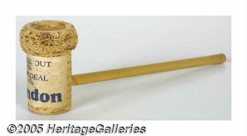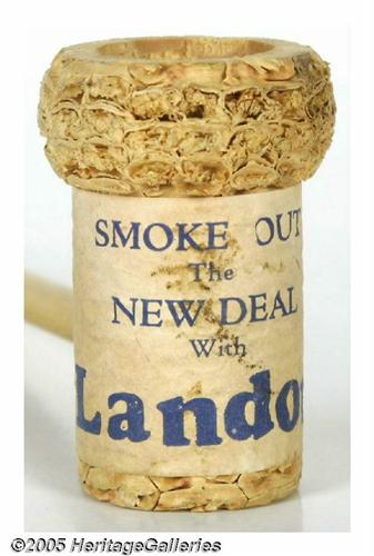 <B>Unique and Delightful 1936 Alf Landon Corncob Pipe</B></I> Paper label reads, "Smoke Out the New Neal with Landon." One of the neatest 3-D political collectibles of this era which we have encountered! Great condition. Length 5.75". Lot:263