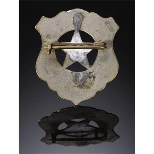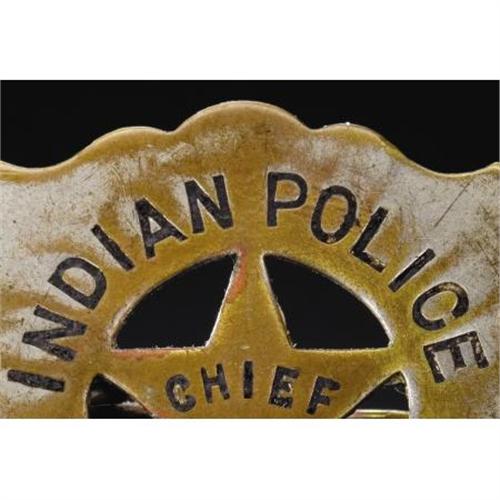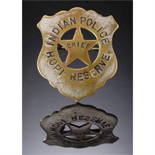 <B>UNIQUE AND HISTORIC HOPI RESERVATION INDIAN POLICE CHIEF CIRCA 1900-15</B></I> - This unusual and rare Hopi Indian Police Chief badge is in the form of a cutout shield. At the center of the shield is the word 'Chief'. The badge has a loop and pin back and is stamped 'Adams S & S Co. St. Louis' on the back at top right.<I> From The George Jackson Collection.</B></I><BR><BR><b>Shipping:</b> Miscellaneous Collectibles, Smal (<a target="_blank" href="http://www.heritageauctions.com/common/shipping.php">view shipping information</a>)