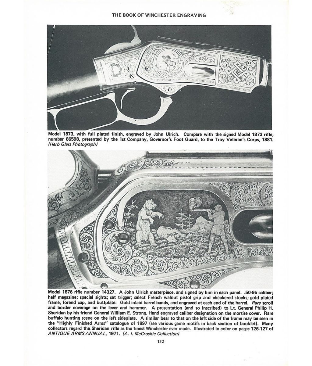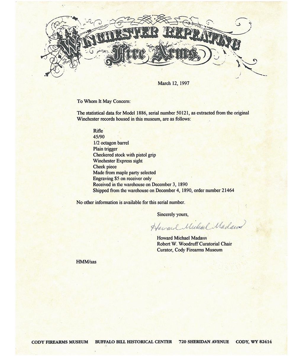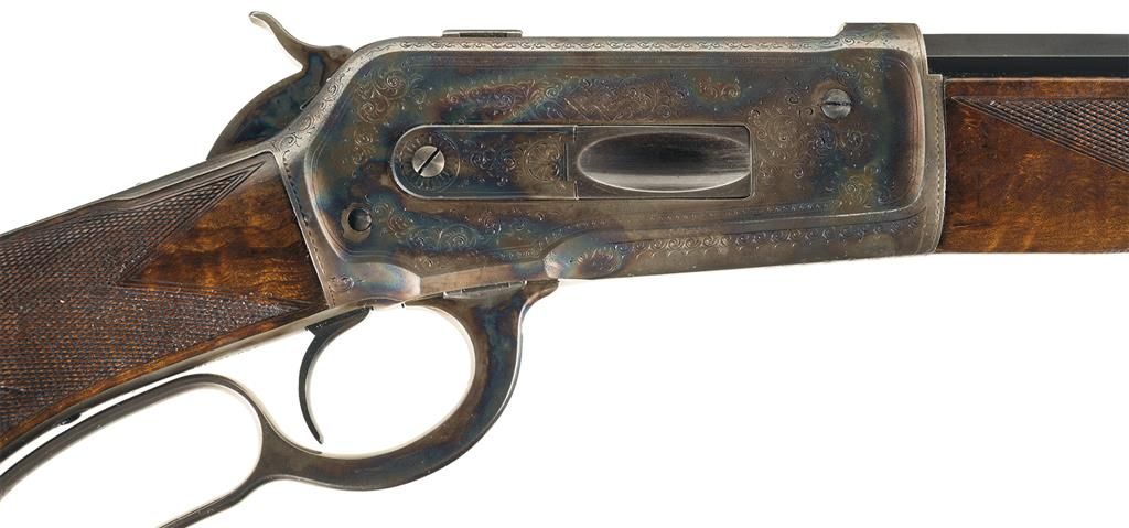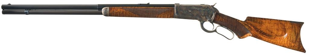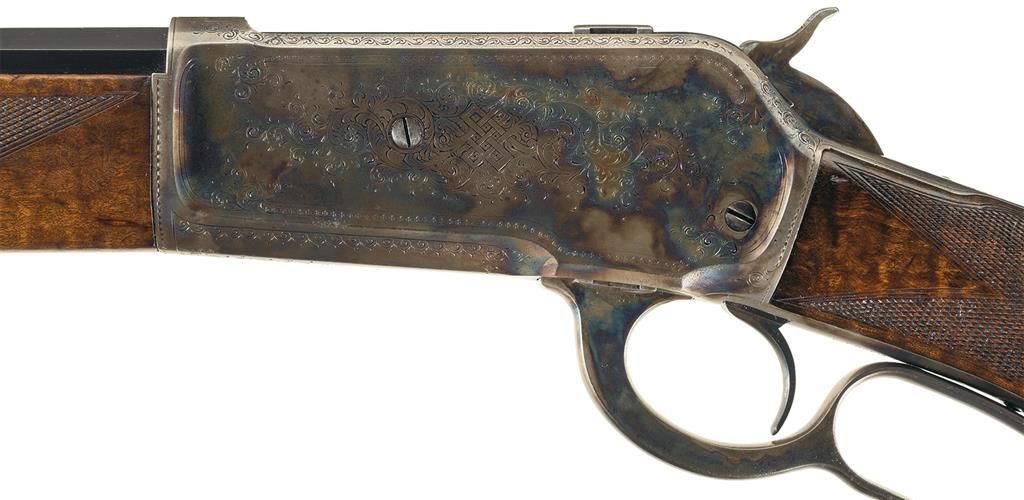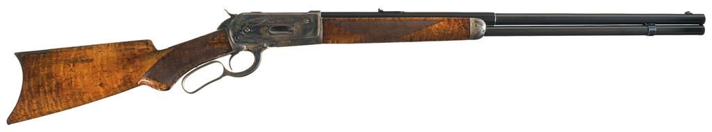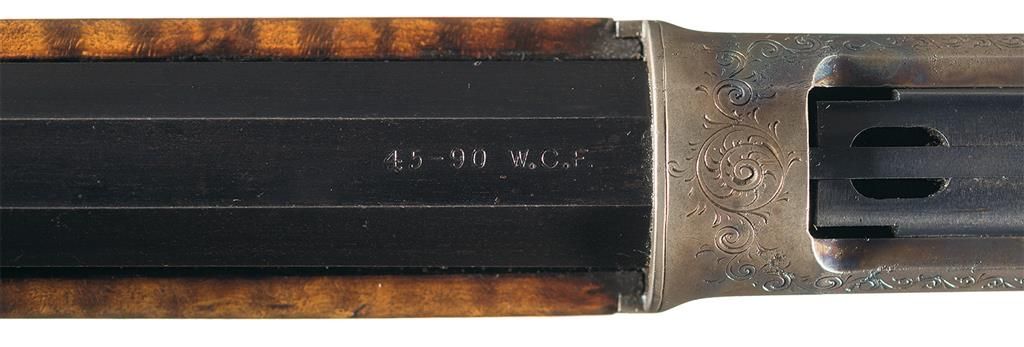 This is a very nice example of a rare Deluxe Winchester Model 1886 Rifle with signed factory engraving and numerous special order features. The rifle is accompanied by a letter from the Cody Firearms Museum that verifies the rifle configuration, caliber, 1/2 octagon barrel, plain trigger Winchester express sight, checkered pistol grip stock with cheek piece and "Made from maple party selected" and "Engraving $5 on receiver only". The rifle was received in the warehouse on December 3, 1890 and shipped to order number 21464 on December 4, 1890. The sides, top and bottom of the receiver and upper tang are factory engraved by Master Engraver John Ulrich. The engraving features delicate scrollwork and borders with distinctive interlinked rectangular motif (a similar design is on the John Ulrich engraved rifle illustrated on page 152 of "The Book of Winchester Engraving" by R.L. Wilson). The signature "J.ULRICH" is stamped in tiny letters on the lower tang behind the trigger. This rifle is mounted with a rarely encountered fancy grain XX maple stock with Style H checkering on the forearm and grip area, and a carved cheekpiece. In addition to the factory engraving and rare stock wood and configuration, the rifle has the rare combination of half round/half octagon barrel with full length magazine; part round barrels usually were fitted with short magazines. The barrel has a special order Lyman "Hunting" front sight with ivory insert and special order "Winchester Express" rear sight with three folding leaves and platinum sight lines. The top barrel flat is marked "-MANUFACTURED BY THE-/WINCHESTER REPEATING ARMS CO. NEW HAVEN.CONN. U.S.A.-" ahead of the rear sight and "45-90 W.C.F." at the breech. "-MODEL 1886-" is marked on the upper receiver tang bordered by an engraved single line. In addition to the "J. ULRICH" signature, the bottom of the lower tang is stamped with the 1884 and 1885 patent dates behind the trigger and the script serial number "50121" ahead of the tang screw. The left side of the lower tang is stamped with the assembly number "333" followed by "XX" and "CM". "333" is also stamped in the upper tang inlet of the stock. All Winchester Model 1886 rifles with special order features are highly desirable. This rifle has several very rare features including signed factory engraving, maple stock and forearm with carved cheekpiece, half-round barrel and full length magazine.