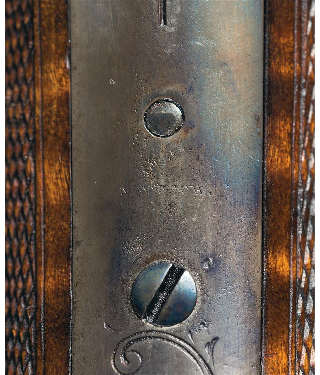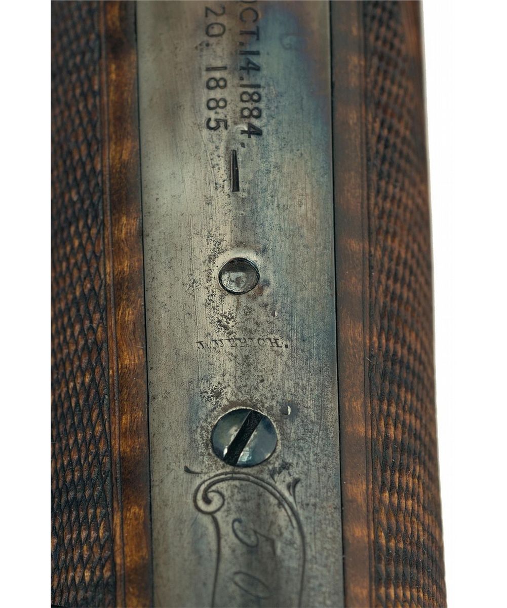Very fine. The barrel and magazine have 95% of the original blue finish with some thinning on the bottom of the magazine near the forearm. The bolt has nearly all of the original blue finish remaining while the loading gate has faded to a blue-gray patina. The forearm cap, receiver, hammer, lever and buttplate retain 75% of the period refinished casehardened finish. The case colors are slightly faded and the high points on the receiver, upper tang, lever and buttplate show traces of silver patina. There is some very fine and nearly undetectable handling pitting on contact points on the receiver, upper tang and lever. The delicate and flawlessly executed engraving is sharp. The stock and forearm are very good with light handling wear and finish loss on contact points. The diamonds on the checkered panels are slightly flattened and both the stock and forearm have some scattered and very minor handling marks. This is an outstanding fully documented Deluxe Winchester Model 1886 rifle with J. Ulrich signed factory engraving and an unusual number of rare and significant special order features including a maple stock.