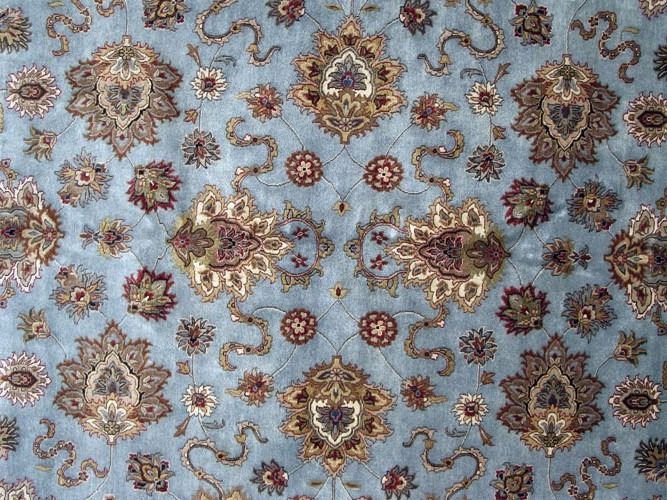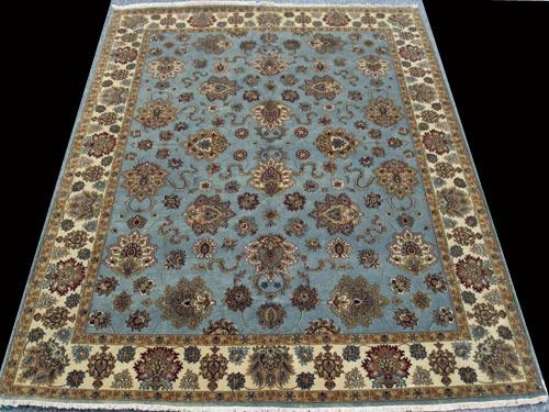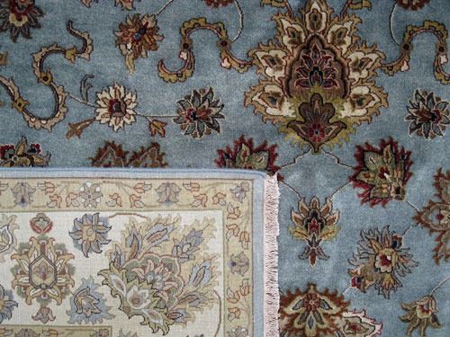 Unique and rare color fine silk blend Persian-Pak Tabriz Rug. 100% natural, vegetable dye, hand woven, pure silk, finest baby lamb's wool pile on cotton foundation. This is a strikingly lustrous all-over shah-Abbasi floral design over a breathtaking Williamsburg blue color background with pure silk highlights. The expression "all-over" is referred to rugs with a pattern spread out throughout the rug, where the design repeats itself over and over again. The advantage is that furniture can be placed anywhere on the rug without interrupting the pattern. The crisp and well defined curve-linear design is a testament to the fine weave and the artistic workmanship. Please notice the glowing silk highlights that give this piece a three dimensional character. Where a typical rug is limited to a range of twelve and sixteen colors, this beautiful piece features more than twenty eight different colors, creating an exquisite tapestry of colors that is feast for the eyes. This lovely piece is masterfully hand woven, knot by knot, and has about 180 knots per square inch and it is very well packed. It takes over three years to weave this beauty. This is a truly captivating piece. Size: 10 feet X 8 feet . Country of origin: Iran.
