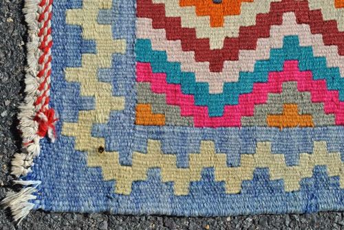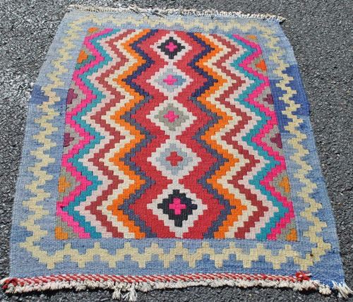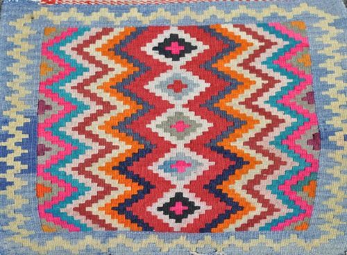 Handmade rug antique klim, 100% wool pile on cotton foundation. very unique deign and unique rug from iran. this piece is over 100 years old. size: 3 feet 9 inches by 2 feet 9 inches. Country of Origin: Turkey.
