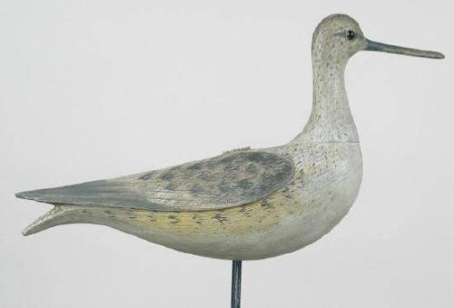 Unique design life size split tail yellowlegs decoy with glass eyes by Martin Collins, Buzzards Bay, MA in XOC. Body is hinged, head is removable and stores on the inside. Signed by the maker on the inside of the body. (decoy)