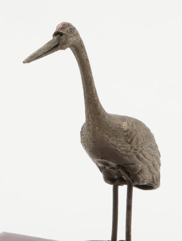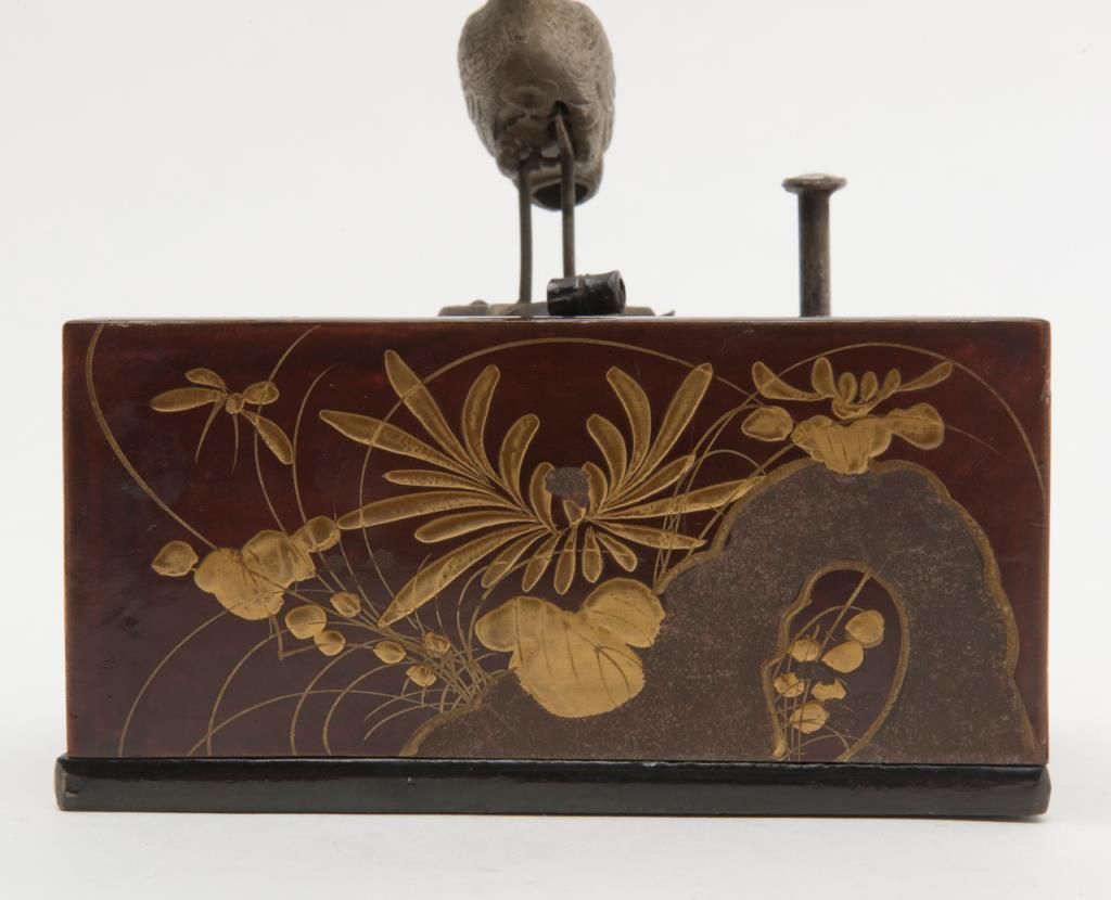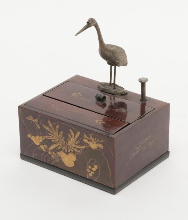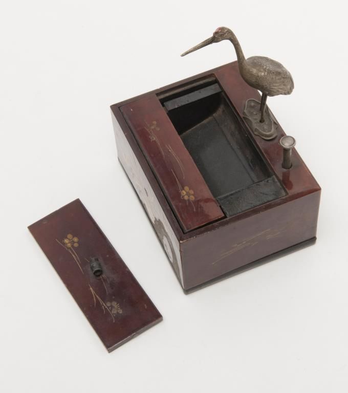 Unique high quality wooden Kiwi cigarette holder and dispenser, approx. 5-1/2” wide X 4-1/4” deep X 3” high, nicely lacquered with gold painted florals; metal long beak crane is actuated by a metal plunger that opens a “door” allowing thecrane to pick up a cigarette from within the dispenser with the “door” closing as the plunger is released. A second “door”, closer to the crane, is removable and is where the cigarettes are fed into the dispenser; overall condition isvery good to near fine; we would date this piece to WW II vintage or earlier; Japanese characters on inner dispenser mechanism. Est.: $300-$600.