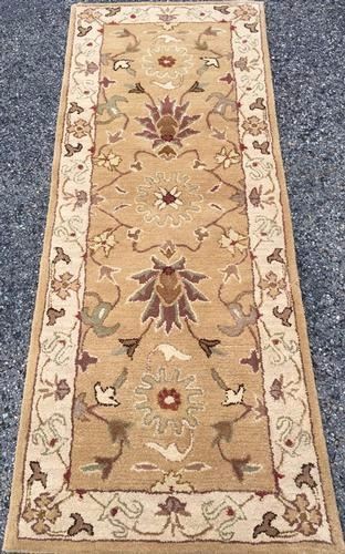 Unique size and unusual sultan-abad design runner. 100%natural, vegetable dye, hand woven, worsted wool pile on cotton foundation. This captivating floral design runner with all natural vegetable dye has a wonderful lustrous appearance. This unique size runner has a very compact weave. Creases are due to fold and not a defect. Backing is for added protection and padding. Please note that the long shots represent the true colors. Size: 6 feet X 2 feet 3 inches. Country of Origin: Tibet.