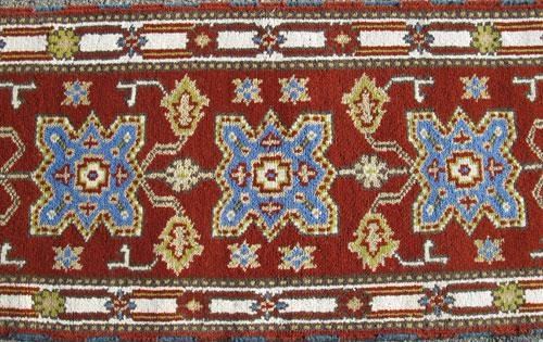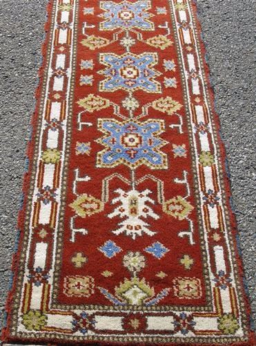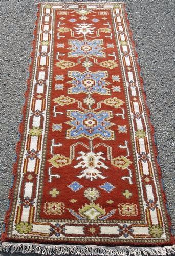 Unique size, handsome Shirvan-Kazak design Runner. 100%natural, vegetable dye, hand woven, wool piles on cotton foundation. This is a rare and unusual size runner of geometric design over a beautiful deep cherry red color background. This charming runner has a fairly lush pile. Size: 7 feet X 2 feet 2 inches. Country of Origin: Karabak.