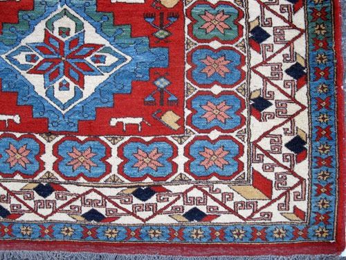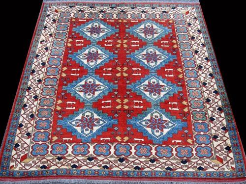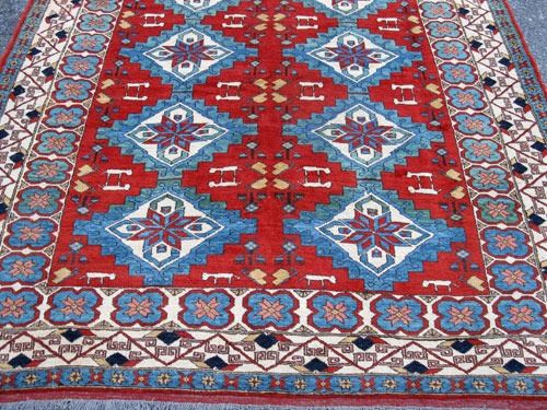 Unique and rare square size, exquisite fine handmade Karabak rug. 100%natural, hand woven, vegetable dye, baby lamb's wool pile on cotton foundation. the multiple repeated medallion of a Shirvan design over a warm shade of red color framed by a contrasting beige color border with a geometric pattern, creates an aesthetically appealing art work. moreover this charming piece is adorned with a collection of animals. Please notice the sophisticated interlocking pattern in the border, which is quite rare and unusual to come across in a village made piece. These lovely pieces are woven in the remote mountainous areas of Karabak. It is quite intriguing to see such sophistication in design woven painstakingly into an art underfoot as such. The art of carpet weaving in the Karabak, Shirvan territory is undoubtedly influenced by a number of objective factors, among them the geographical location of this region, at the joint of the east and the west. Here, along the greater Caucasus ridge, lies the borderline between Asia and Europe. Here is the historical juxtaposition point between Islamic and Christian cultures. Many long caravans passed through this territory over the centuries up until the middle of 20th century. Charming and happy colors are one of the characteristic of Shirvan rugs. Size: 6 feet 6 inches X 6 feet 2 inches. Country of Origin: Karabak.