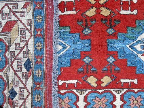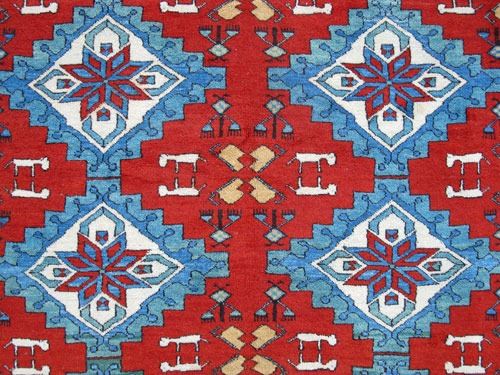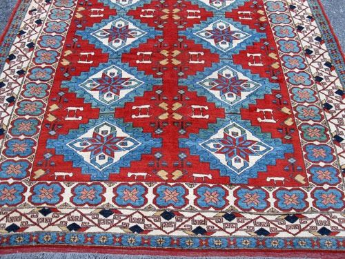 Unique and rare square size, exquisite fine handmade Karabak rug. 100%natural, hand woven, vegetable dye, baby lamb's wool pile on cotton foundation. the multiple repeated medallion of a Shirvan design over a warm shade of red color framed by a contrasting beige color border with a geometric pattern, creates an aesthetically appealing art work. moreover this charming piece is adorned with a collection of animals. Please notice the sophisticated interlocking pattern in the border, which is quite rare and unusual to come across in a village made piece. These lovely pieces are woven in the remote mountainous areas of Karabak. It is quite intriguing to see such sophistication in design woven painstakingly into an art underfoot as such. The art of carpet weaving in the Karabak, Shirvan territory is undoubtedly influenced by a number of objective factors, among them the geographical location of this region, at the joint of the east and the west. Here, along the greater Caucasus ridge, lies the borderline between Asia and Europe. Here is the historical juxtaposition point between Islamic and Christian cultures. Many long caravans passed through this territory over the centuries up until the middle of 20th century. Charming and happy colors are one of the characteristic of Shirvan rugs. Size: 6 feet 6 inches X 6 feet 2 inches. Country of Origin: Karabak.