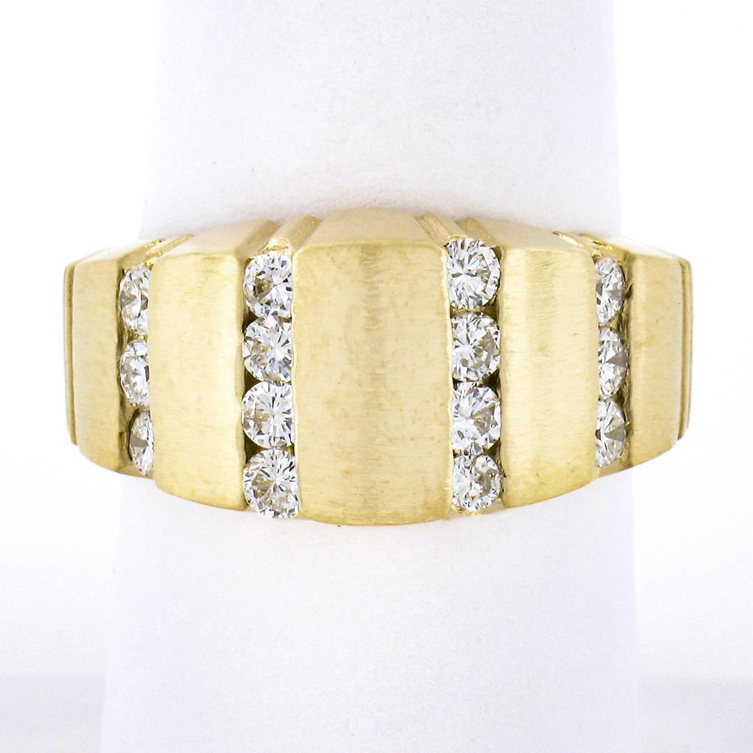 A solid 14k yellow gold wide ring, with 14 round brilliant cut natural diamonds (F/G - VS1/VS2 ; 0.60ctw). The ring is size 8.0, weighs a total of 9.13 grams, and measures 11.10mm wide.
