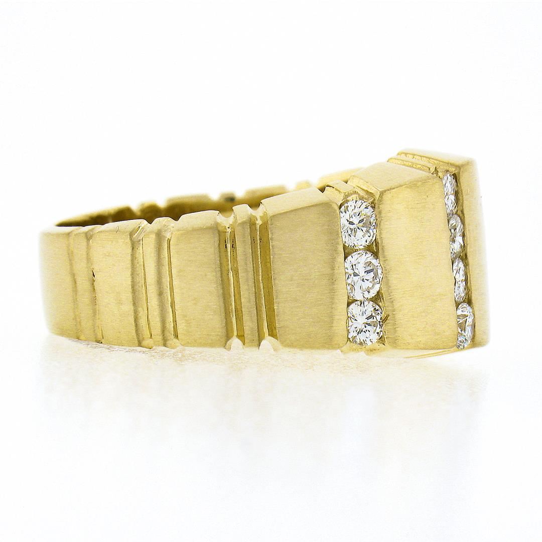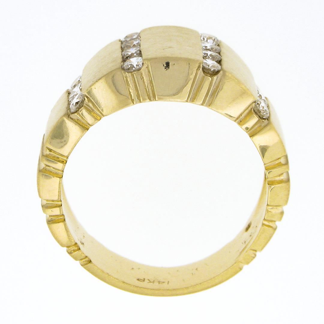 A solid 14k yellow gold wide ring, with 14 round brilliant cut natural diamonds (F/G - VS1/VS2 ; 0.60ctw). The ring is size 8.0, weighs a total of 9.13 grams, and measures 11.10mm wide.