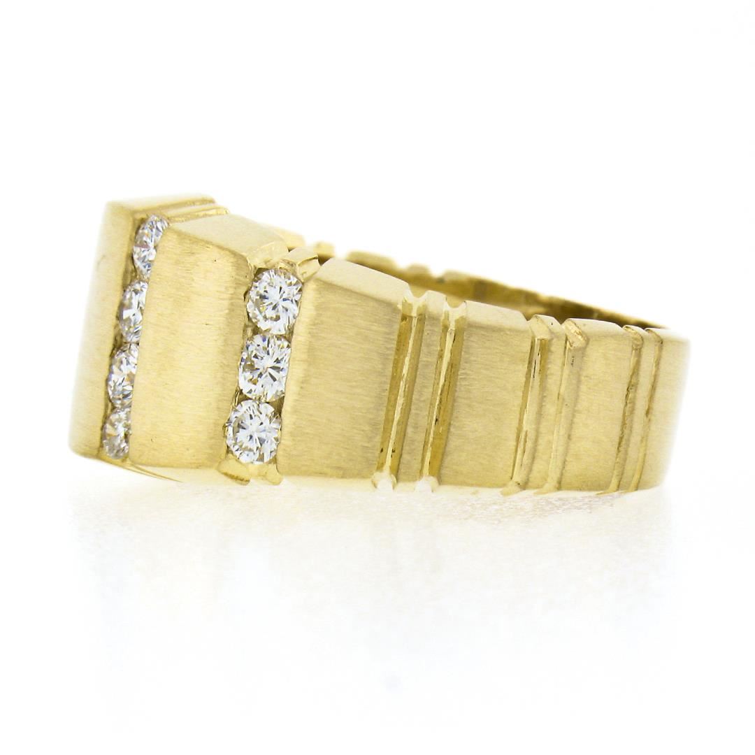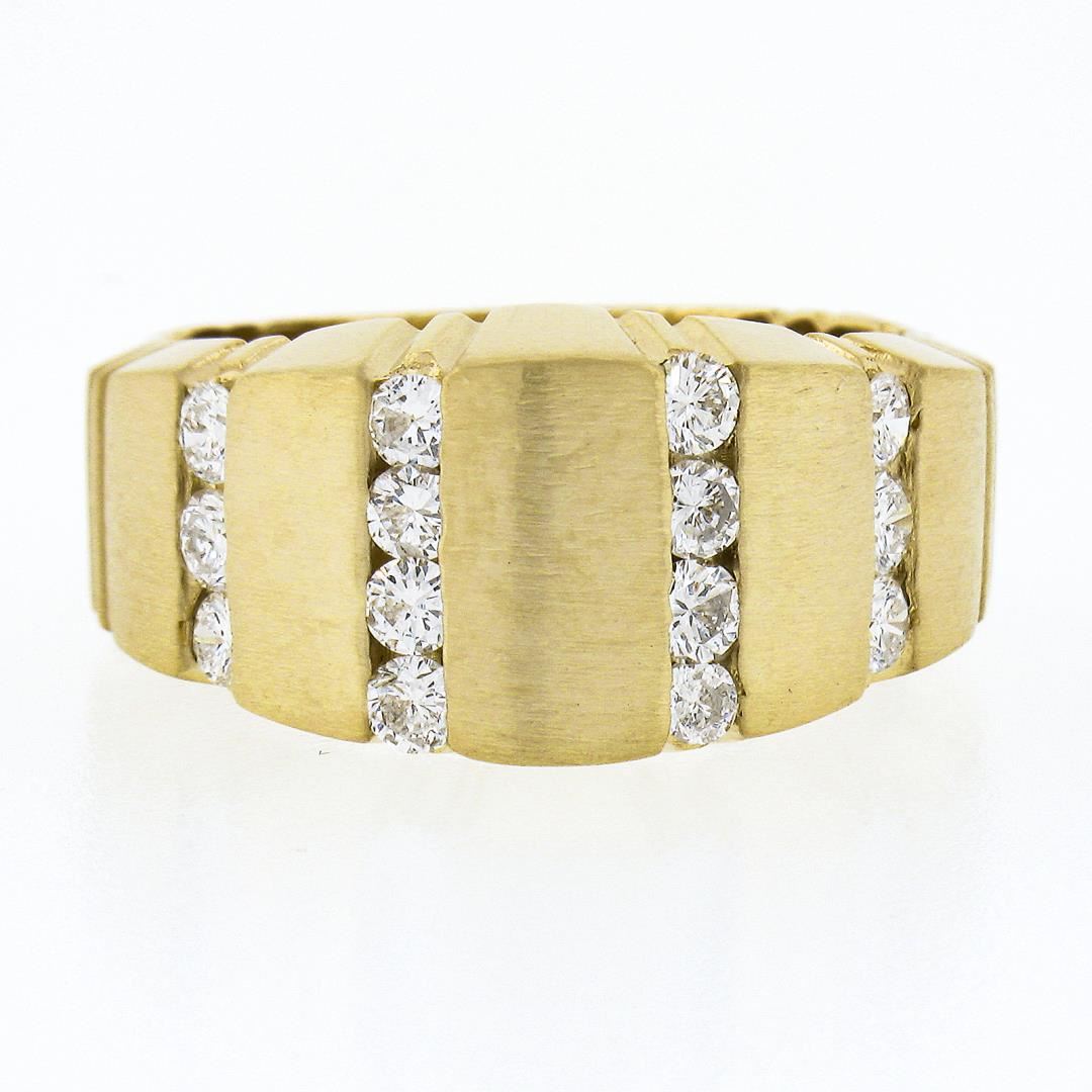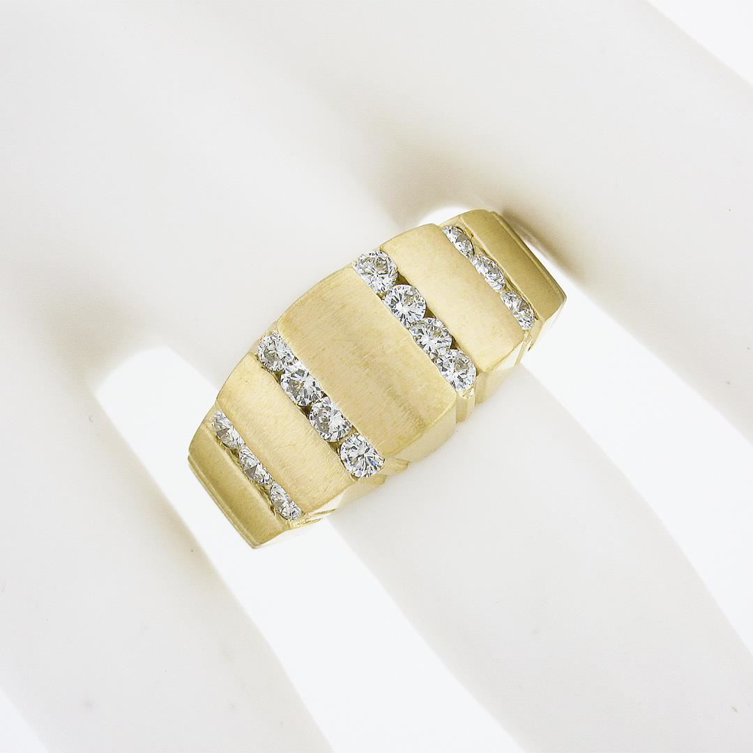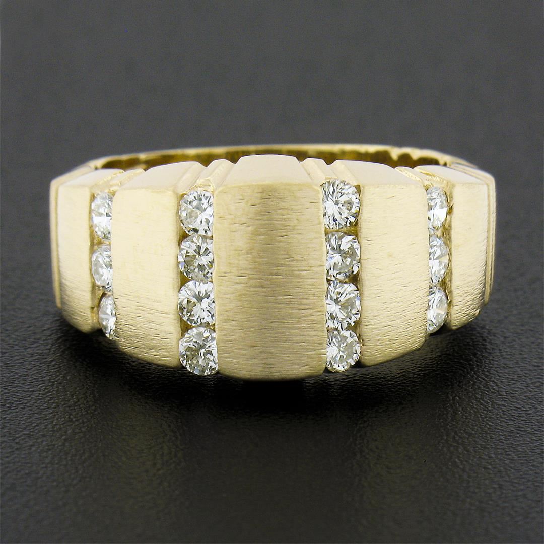 A solid 14k yellow gold wide ring, with 14 round brilliant cut natural diamonds (F/G - VS1/VS2 ; 0.60ctw). The ring is size 8.0, weighs a total of 9.13 grams, and measures 11.10mm wide.