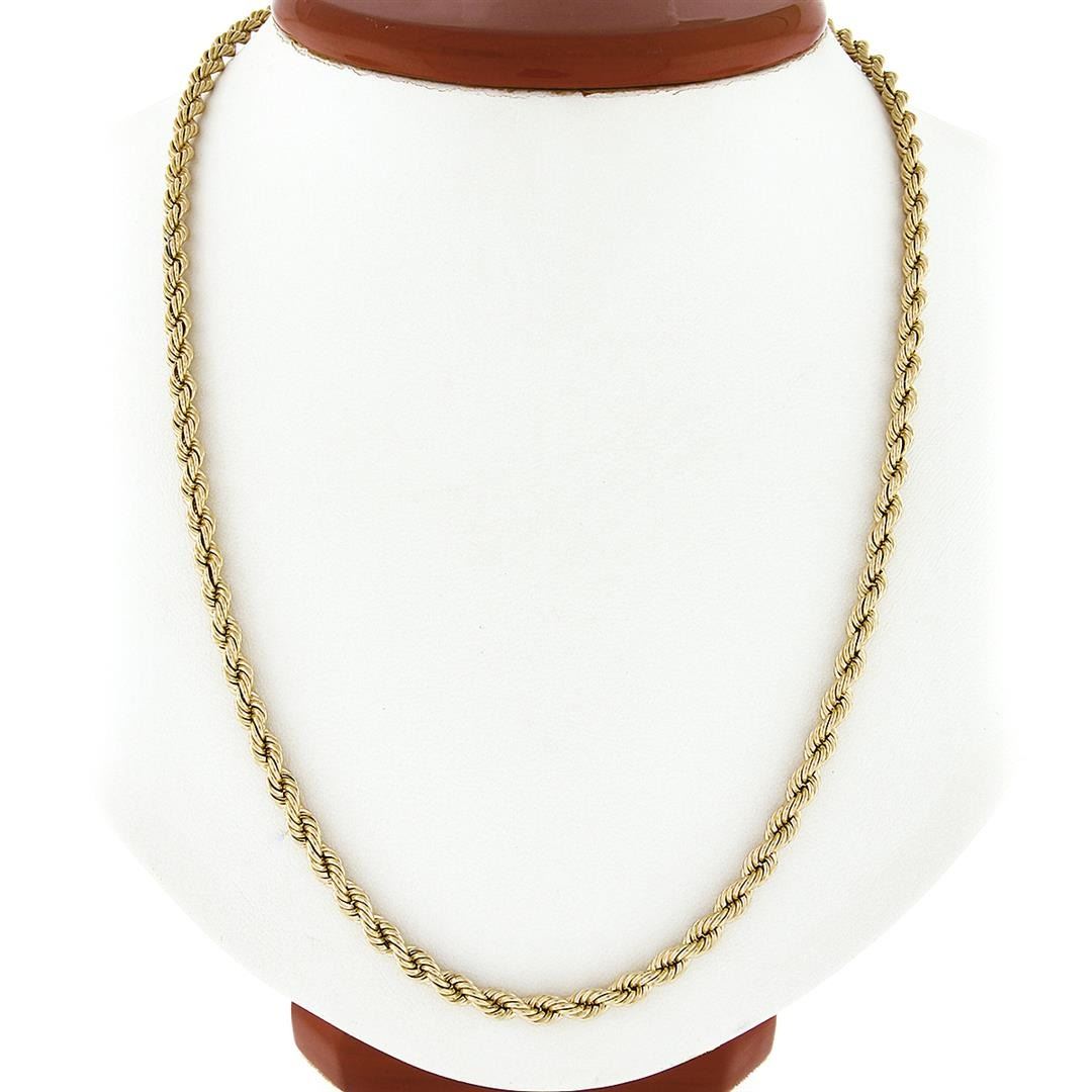 A solid 14k yellow gold rope link necklace. It weighs a total of 31.0 grams, measures 4mm wide, and measures 20.5 inches in length.