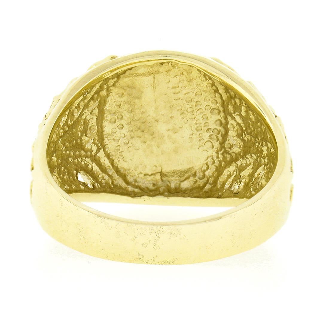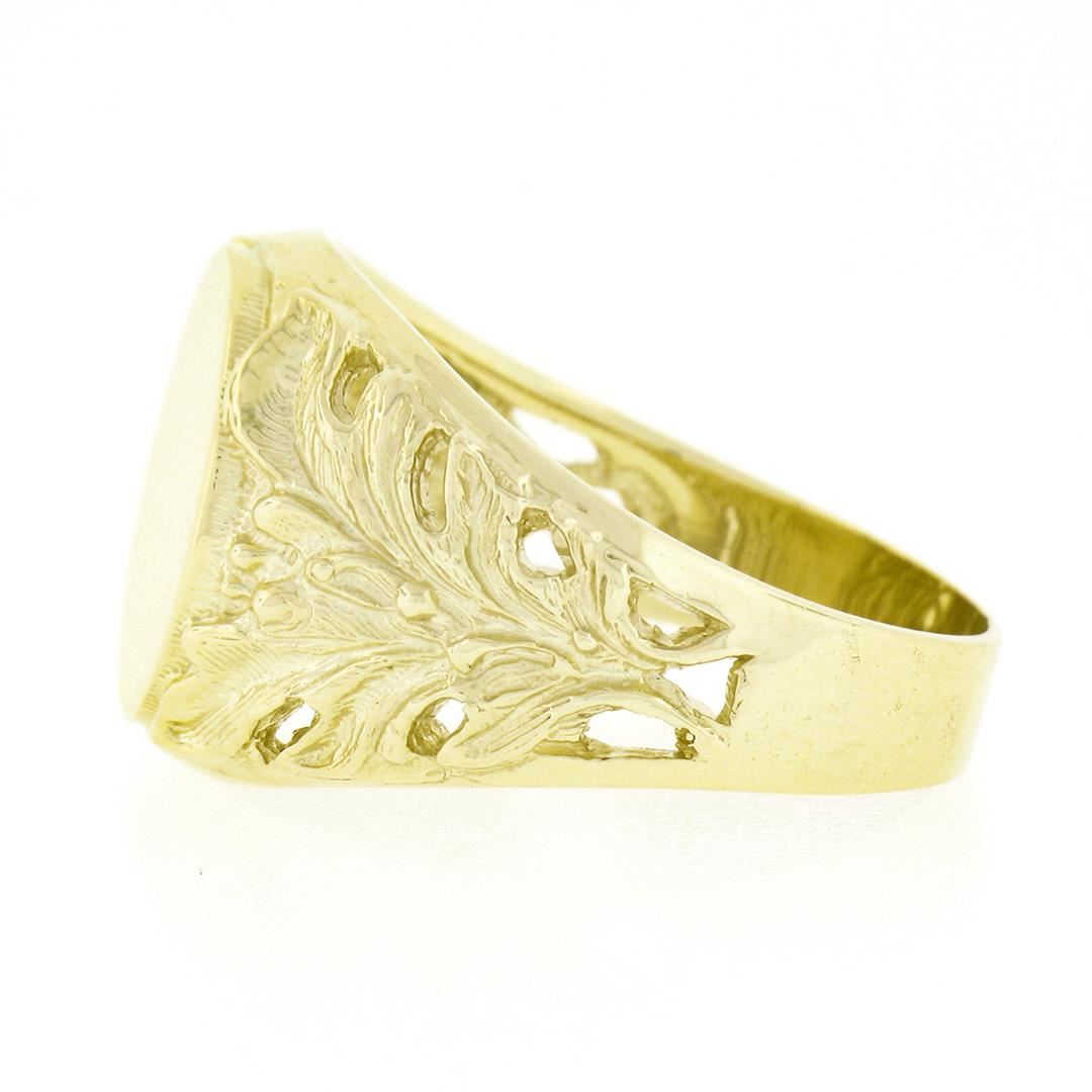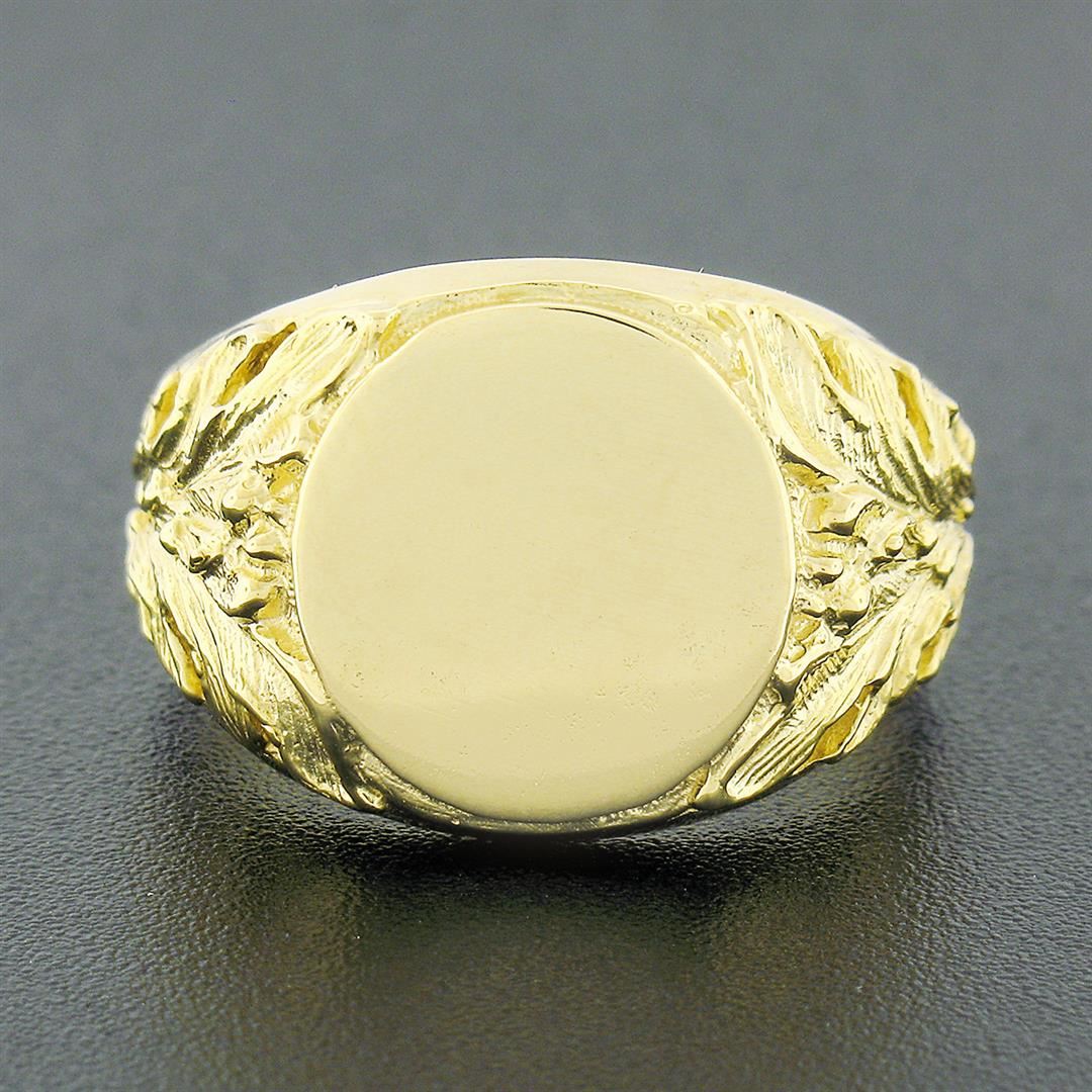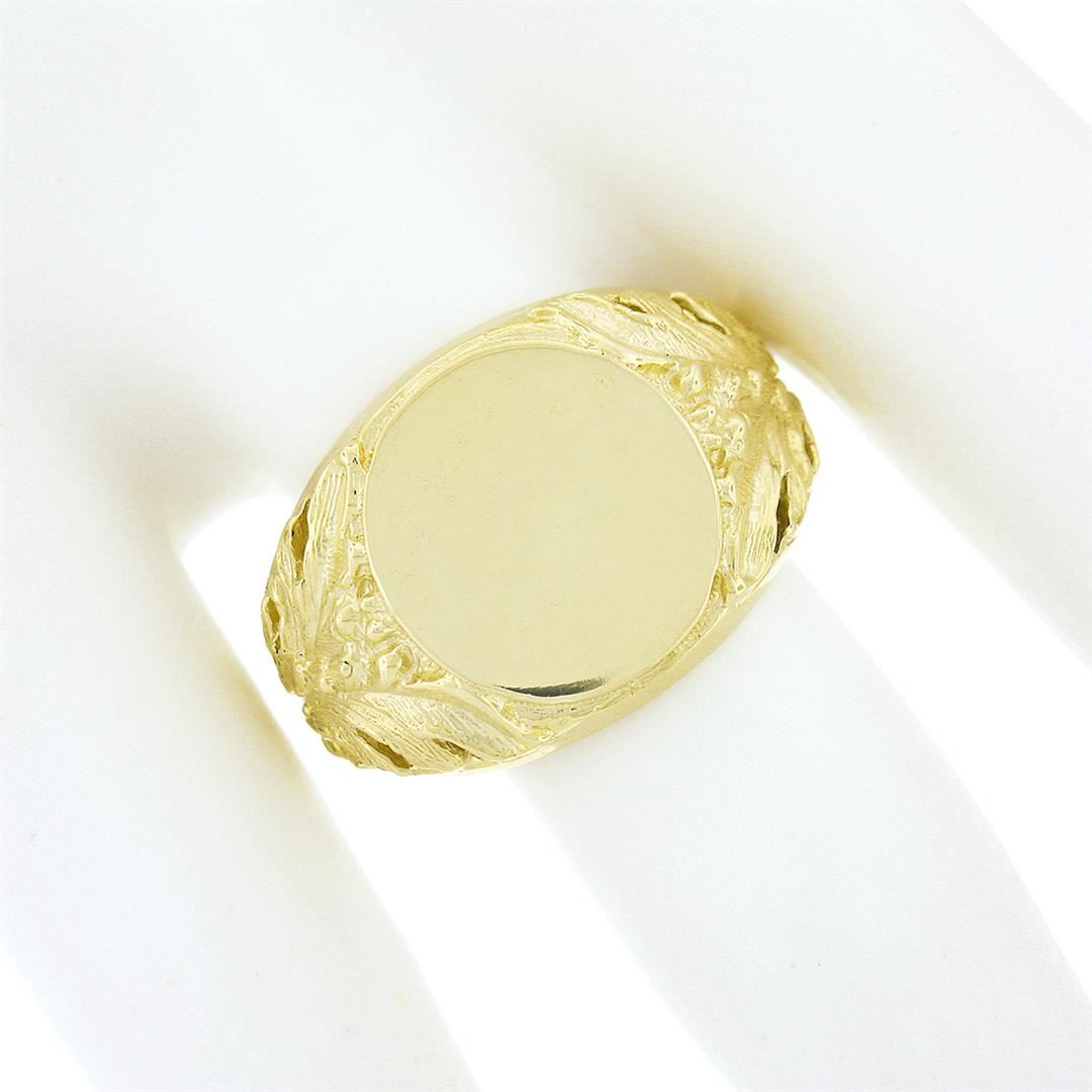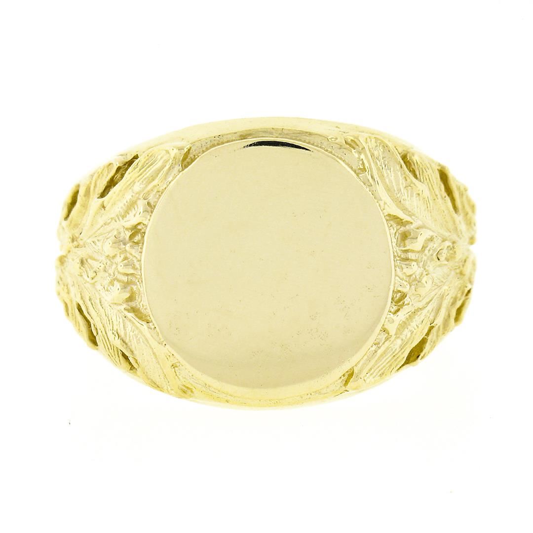 A solid 14k yellow gold signet ring. The ring is size 10, weighs a total of 7.78 grams, and measures 15.40mm wide.