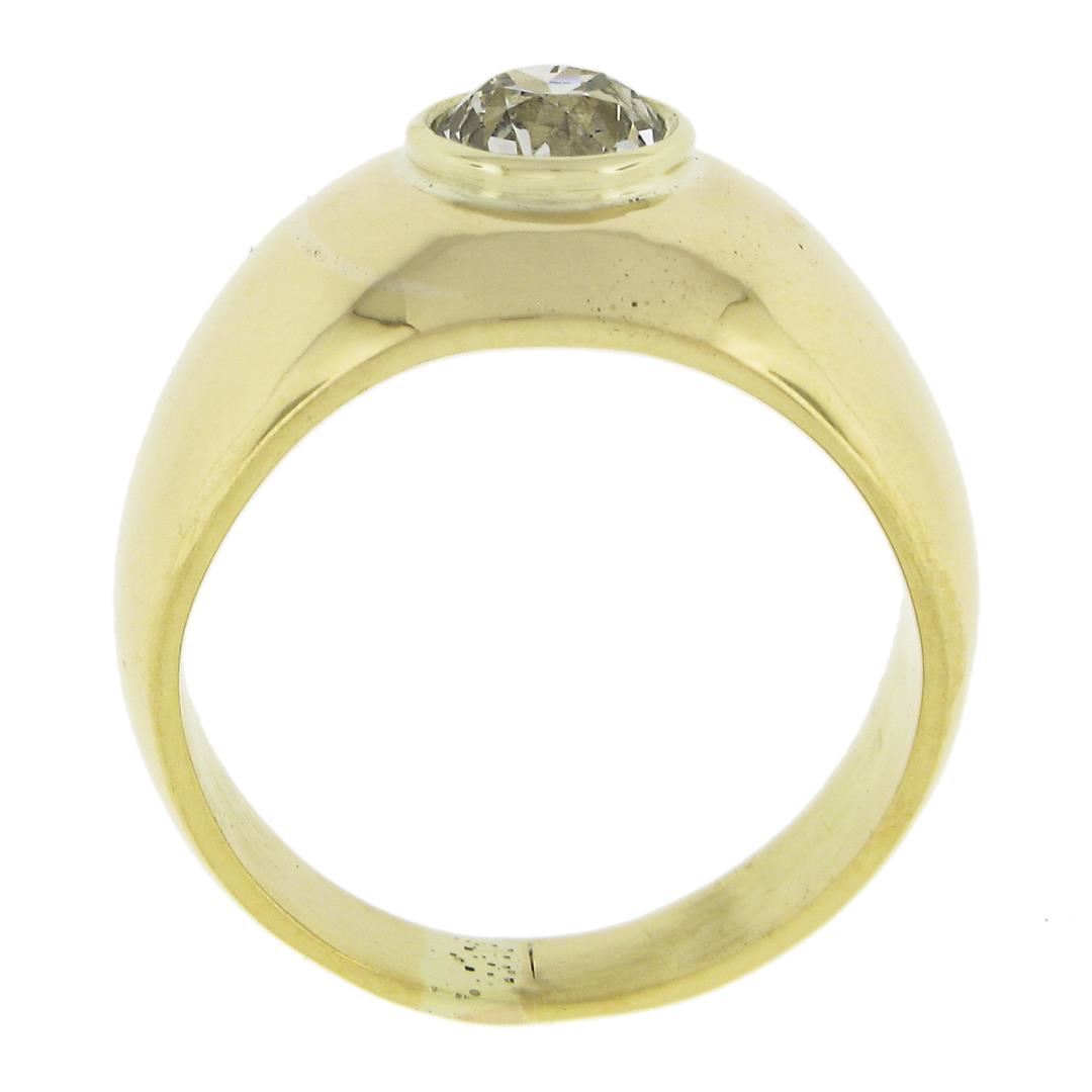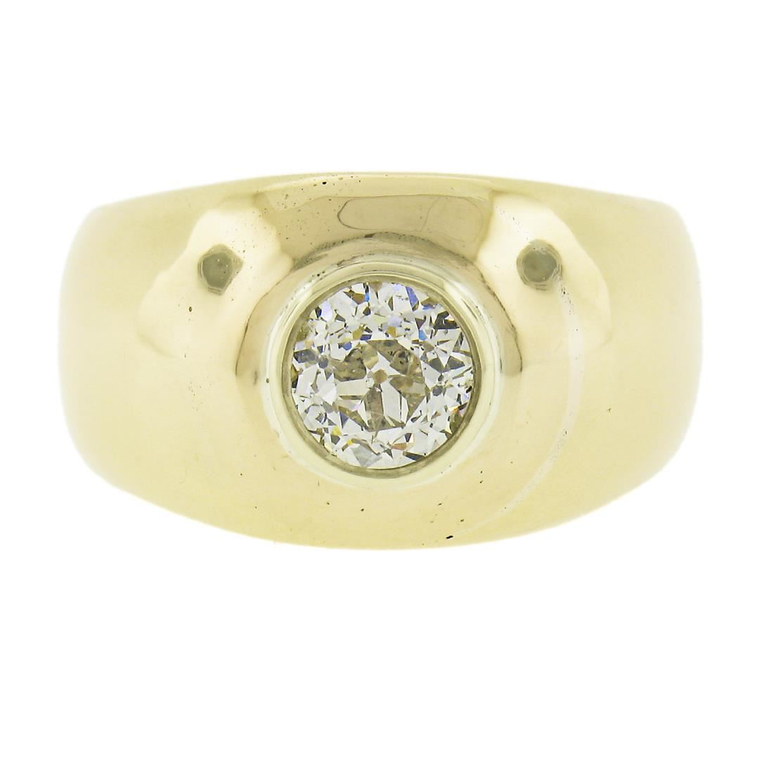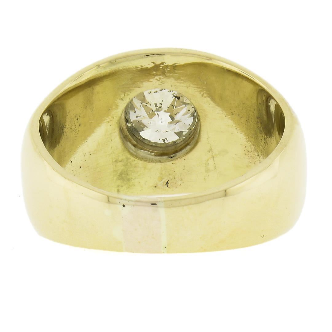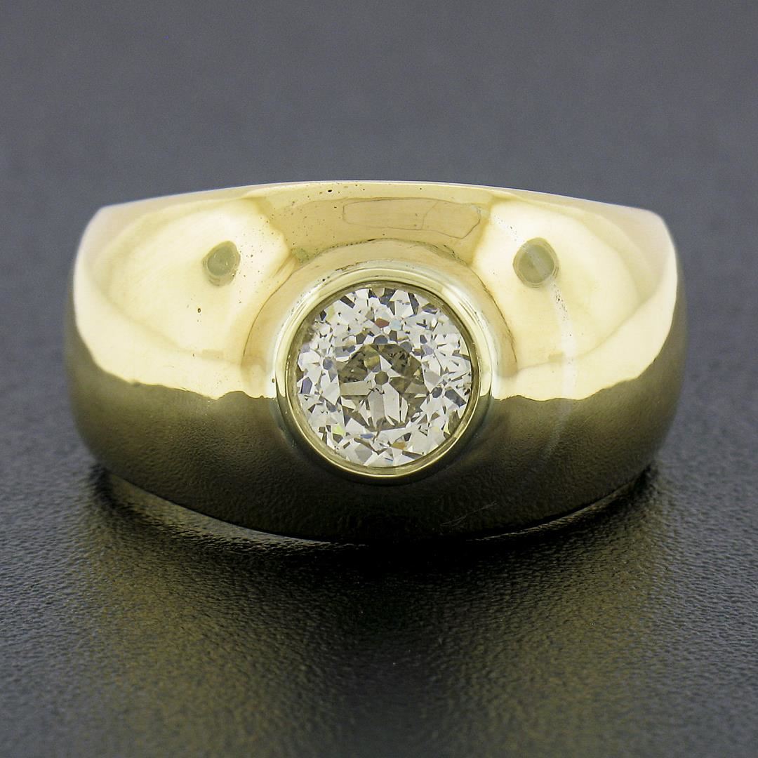 A solid 18k yellow gold solitaire band ring, with 1 round cut natural diamond (L/M - SI2 ; 1.02ct). The ring is size 7.5, weighs a total of 12.87 grams, and measures 12.1mm wide.