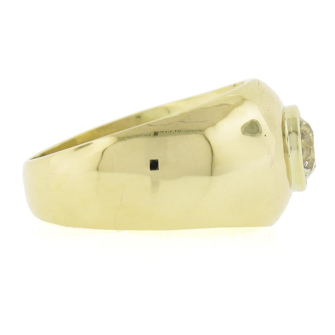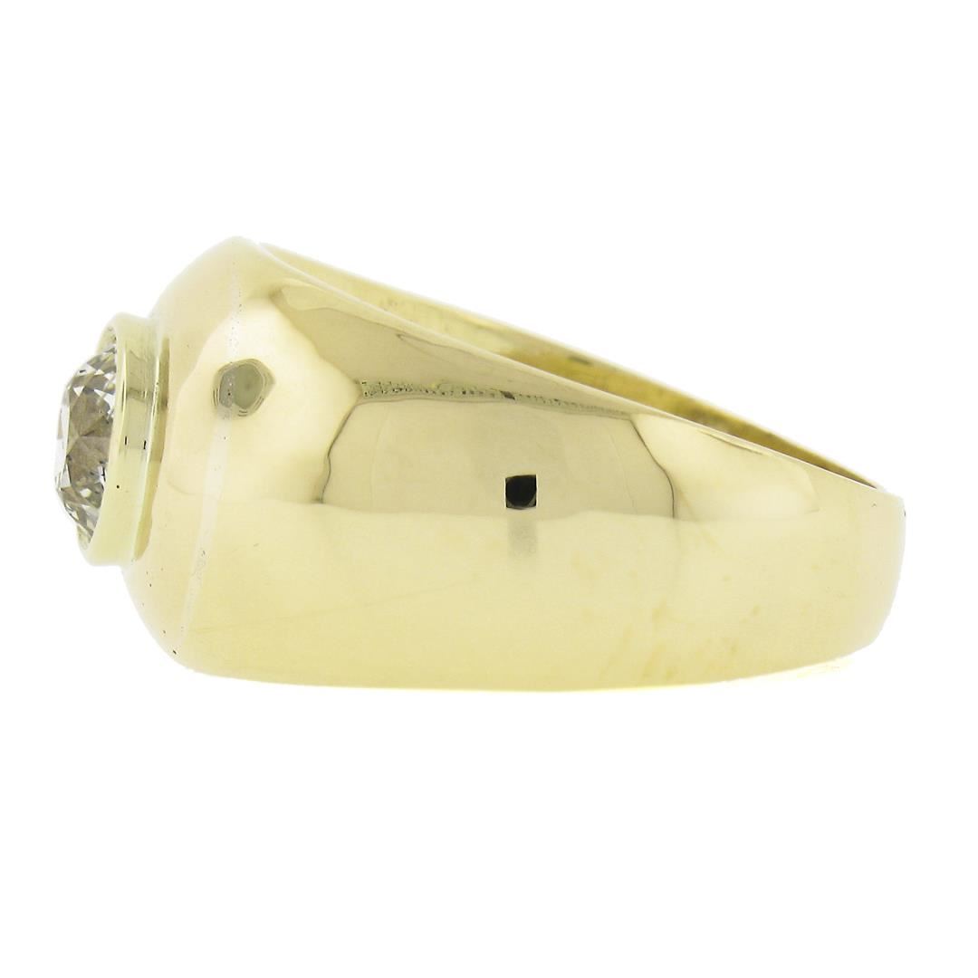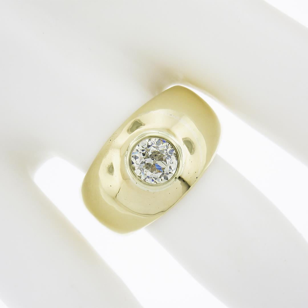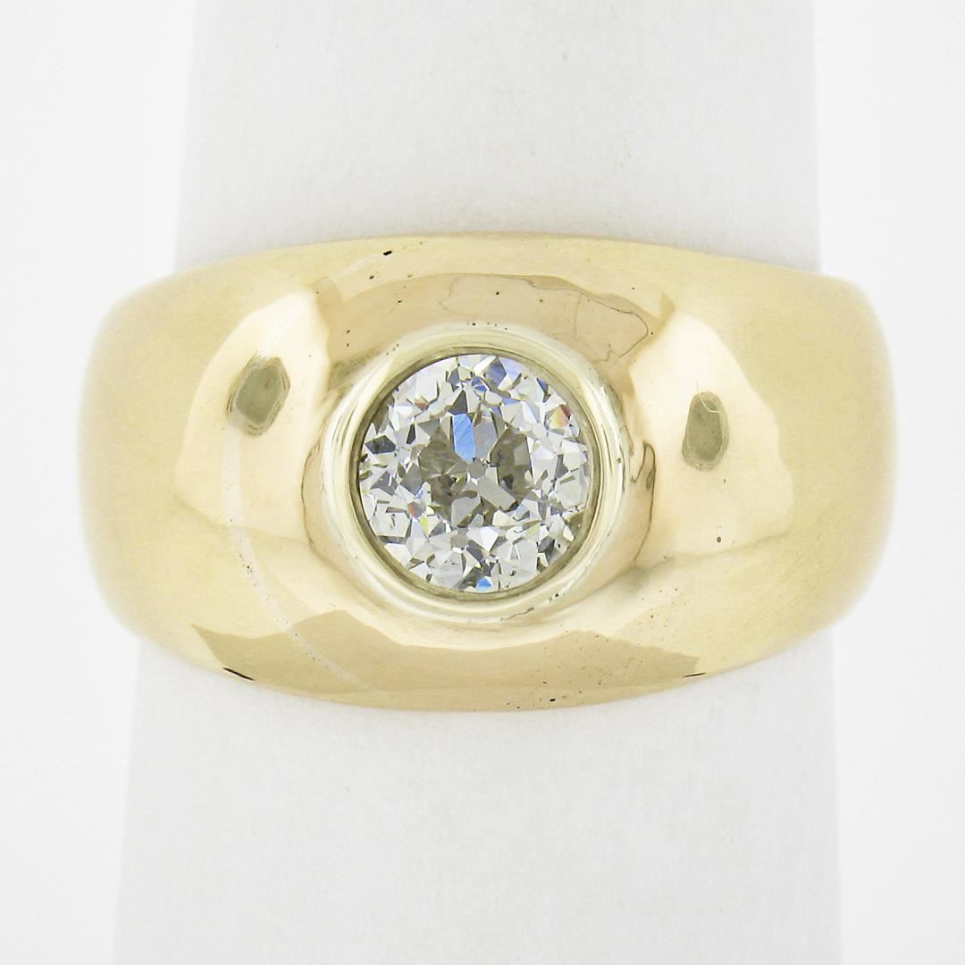 A solid 18k yellow gold solitaire band ring, with 1 round cut natural diamond (L/M - SI2 ; 1.02ct). The ring is size 7.5, weighs a total of 12.87 grams, and measures 12.1mm wide.