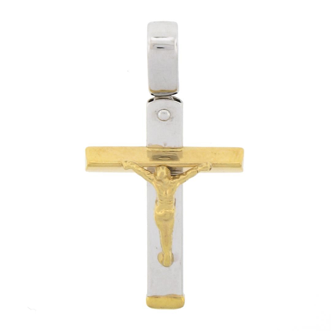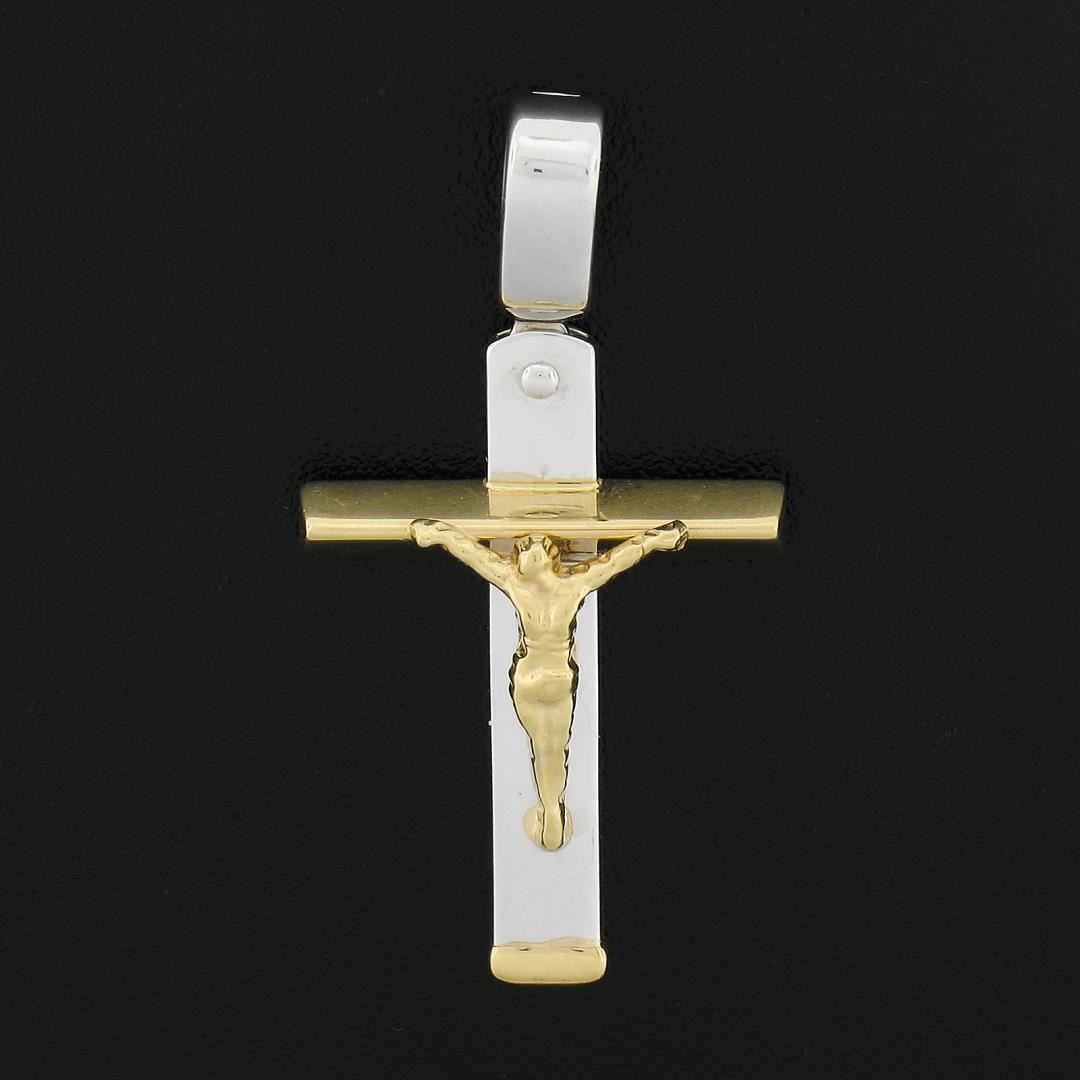 A solid 18k yellow & white gold cross pendant. The pendant weighs a total of 3.15 grams, measures 32.3x17.3mm including the bail, and the inside of the bail measures 4.1x3.9mm.