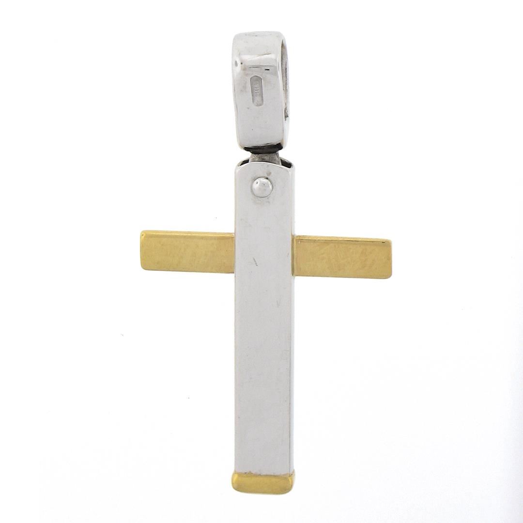 A solid 18k yellow & white gold cross pendant. The pendant weighs a total of 3.15 grams, measures 32.3x17.3mm including the bail, and the inside of the bail measures 4.1x3.9mm.