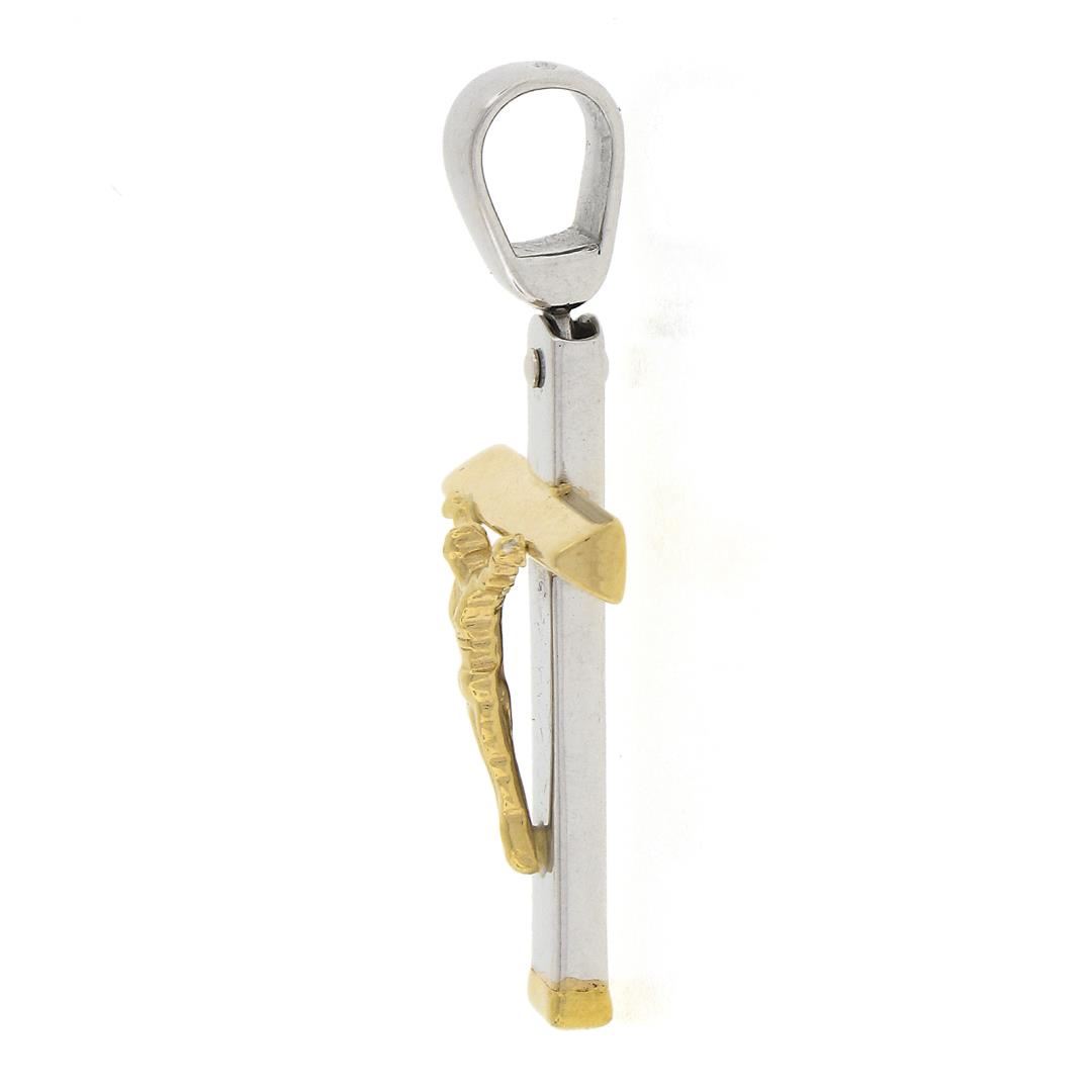 A solid 18k yellow & white gold cross pendant. The pendant weighs a total of 3.15 grams, measures 32.3x17.3mm including the bail, and the inside of the bail measures 4.1x3.9mm.