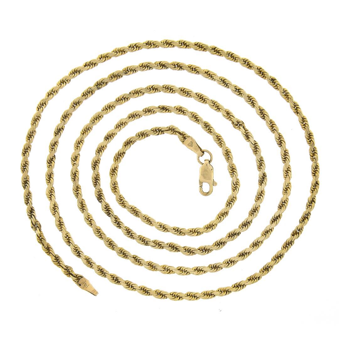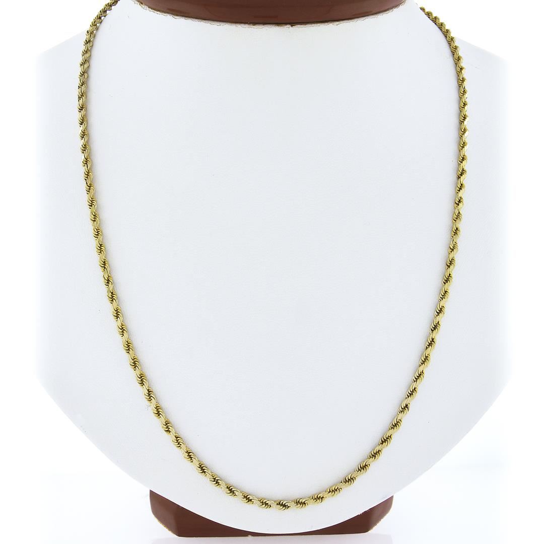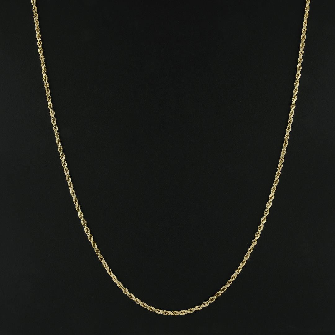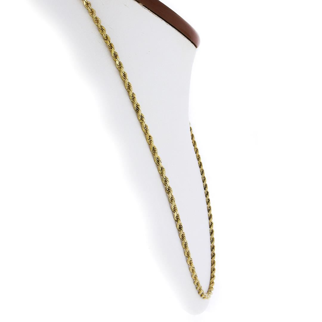A solid 14k yellow gold rope link necklace. It weighs a total of 18.62 grams, measures 2.8mm wide, and measures 30 inches in length.